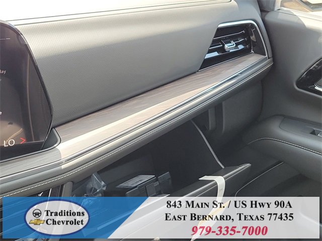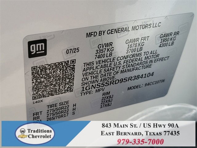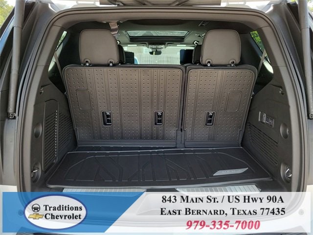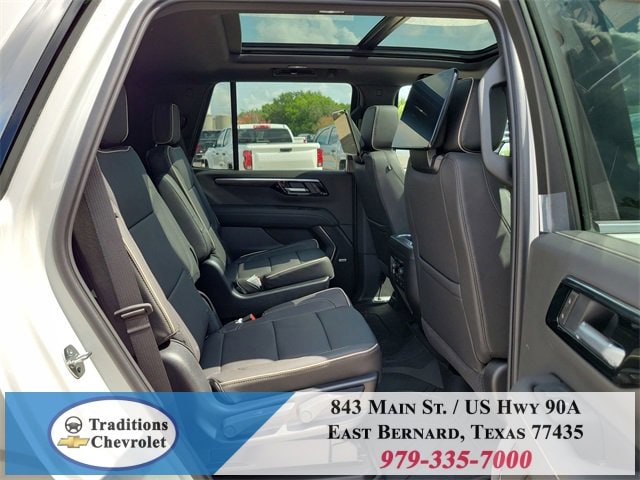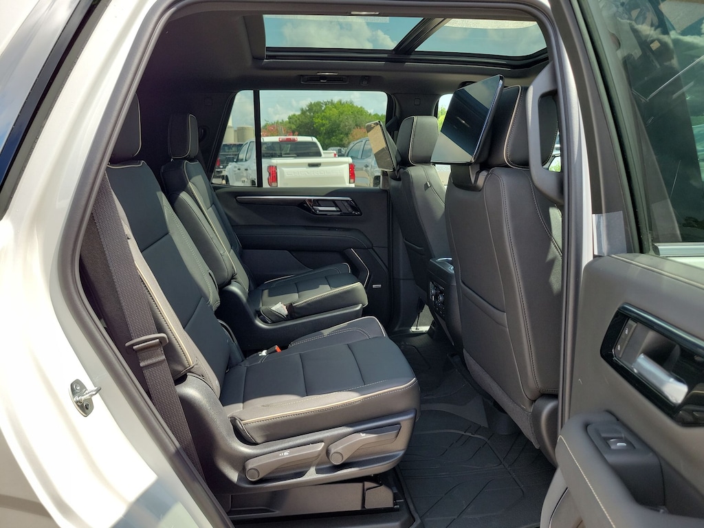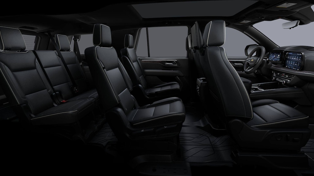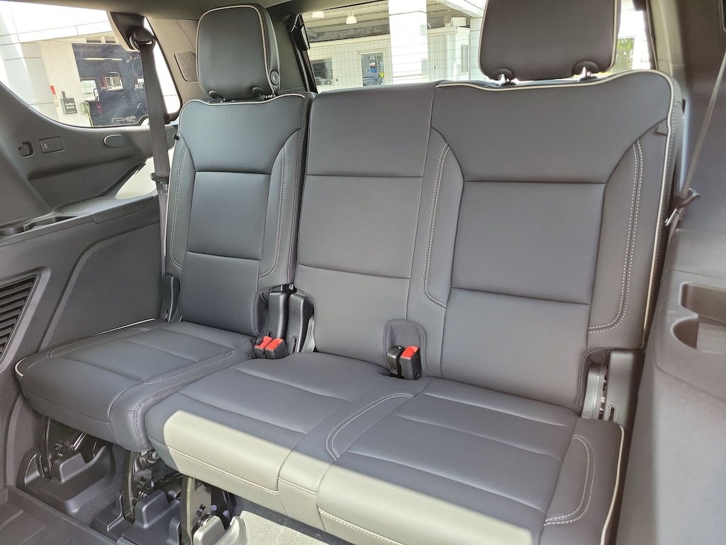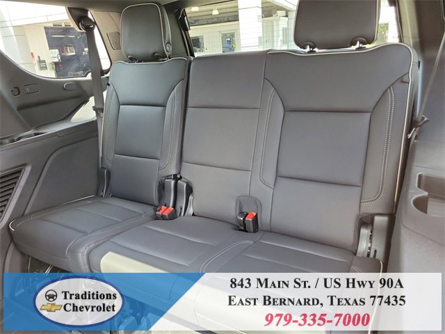 Advanced Security Package (Glass Breakage Sensor, Theft-Deterrent Alarm System, Vehicle Inclination Sensor, and Vehicle Interior Movement Sensor), Preferred Equipment Group 1LZ (3-Spoke Wrapped Steering Wheel, 3rd Row 60/40 Power-Folding Split-Bench Seat, Auto-Dimming Inside Rear-View Mirror, Chrome Mirror Caps, Color-Keyed Carpeting Floor Covering, Dual Exhaust System, Floor Console, Front LED Fog Lamps, Heated 2nd Row Outboard Seats, Heated Steering Wheel, LED Tail Lamps, Memory Settings, Outside Heated Power-Adjustable Mirrors, Power Release 2nd Row Bucket Seats, Rear Power Liftgate, Remote Start, Universal Home Remote, Wireless Phone Charging, 20 x 9 Polished Aluminum Wheels, Front Bucket Seats, and Magnetic Ride Control Suspension), Technology & Entertainment Package (Dual-Pane Power Panoramic Sunroof and Rear Seat Media System), Technology Package (15 Diagonal Multi-Color Head-Up Display and AutoSense Hands-Free Power Liftgate), License Plate Front Mounting Package, Jet Black w/Perforated Leather Seat Trim, 10 Speakers, 3 Years SiriusXM, 3.23 Rear Axle Ratio, 3rd row seats: split-bench, 4-Way Power Driver Lumbar Seat Adjuster, 4-Way Power Front Passenger Lumbar Seat Adjuster, 4-Wheel Disc Brakes, 8-Way Power Driver Seat Adjuster, 8-Way Power Front Passenger Seat Adjuster, ABS brakes, Adaptive suspension, Air Conditioning, Alloy wheels, AM/FM radio: SiriusXM with 360L, Apple CarPlay/Android Auto, Auto High-beam Headlights, Auto-dimming door mirrors, Auto-dimming Rear-View mirror, Auto-leveling suspension, Automatic temperature control, Brake assist, Bumpers: body-color, Compass, Delay-off headlights, Driver door bin, Driver vanity mirror, Dual front impact airbags, Dual front side impact airbags, Electronic Stability Control, Emergency communication system: OnStar and Chevrolet connected services capable, Exterior Parking Camera Rear, Four wheel independent suspension, Front anti-roll bar, Front Center Armrest, Front dual zone A/C, Front fog lights, Front reading lights, Fully automatic headlights, Garage door transmitter, Heated door mirrors, Heated front seats, Heated rear seats, Heated steering wheel, Illuminated entry, Low tire pressure warning, Memory seat, Navigation system: Google built-in compatibility (select service plan required, terms and limitations apply), Occupant sensing airbag, Outside temperature display, Overhead airbag, Overhead console, Panic alarm, Passenger door bin, Passenger vanity mirror, Perforated Leather Seat Trim, Power door mirrors, Power driver seat, Power Liftgate, Power passenger seat, Power steering, Power windows, Power-Retractable Assist Steps, Premium audio system: Chevrolet Infotainment 3 Premium, Radio data system, Radio: 17.7 Diagonal Advanced Color LCD Display, Rain sensing wipers, Rear air conditioning, Rear anti-roll bar, Rear reading lights, Rear window defroster, Rear window wiper, Remote keyless entry, Security system, Speed control, Speed-sensing steering, Split folding rear seat, Spoiler, Steering wheel memory, Steering wheel mounted audio controls,