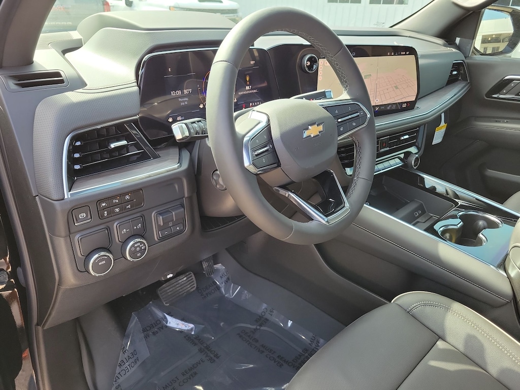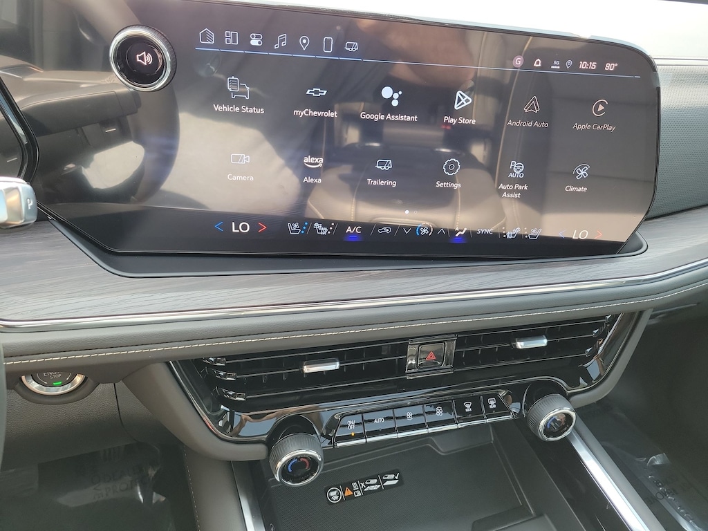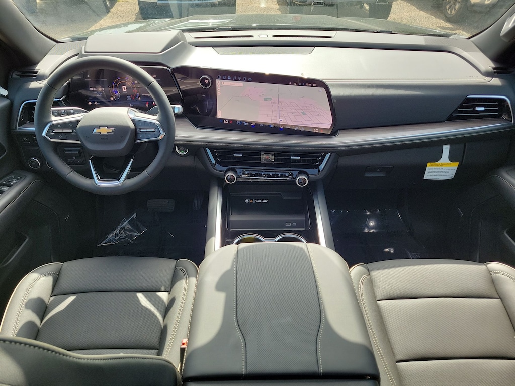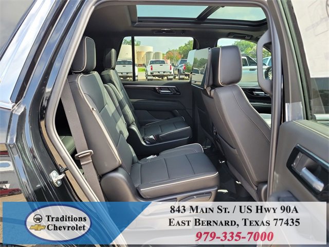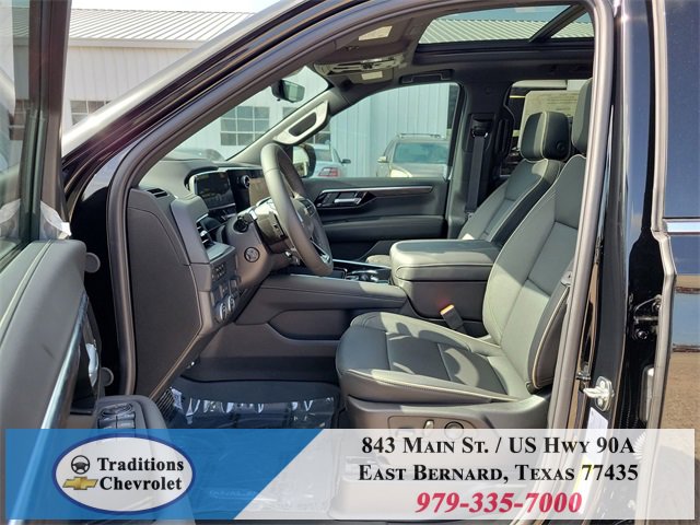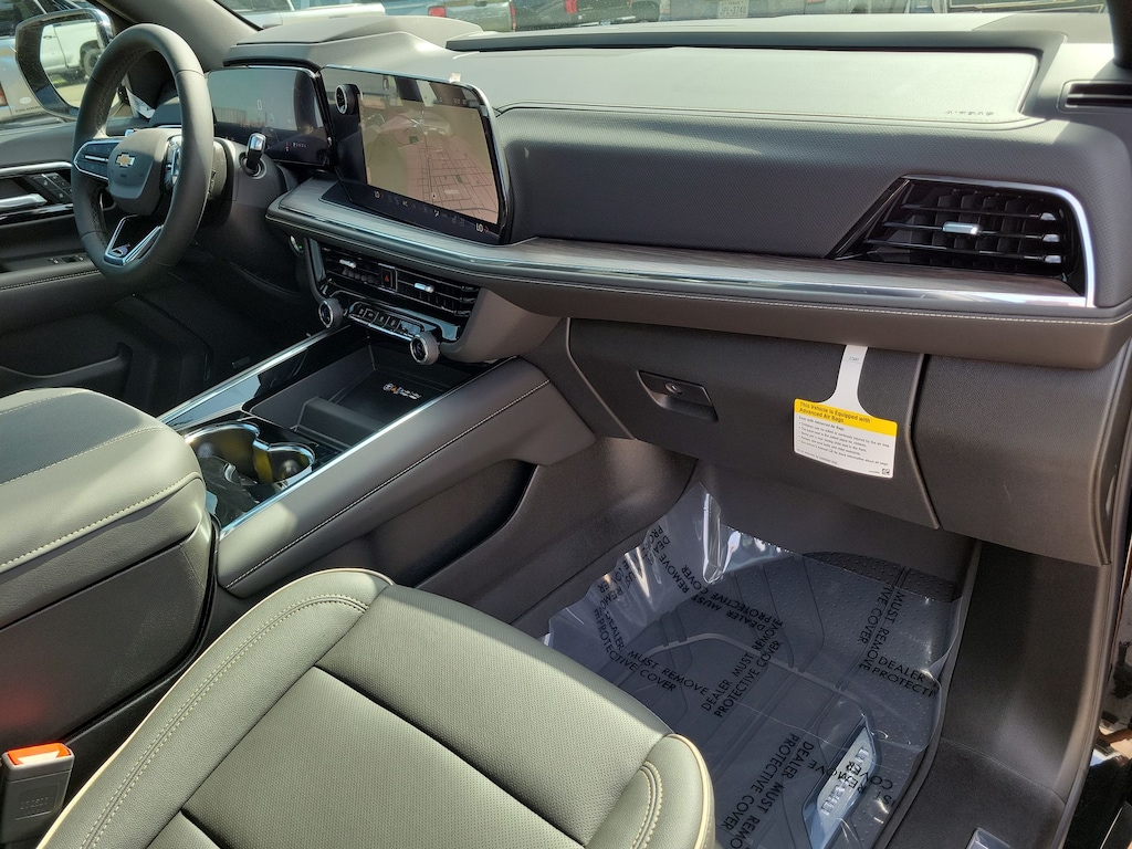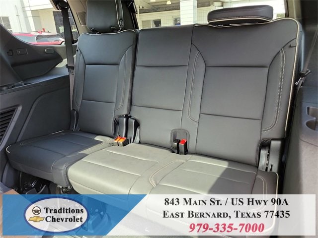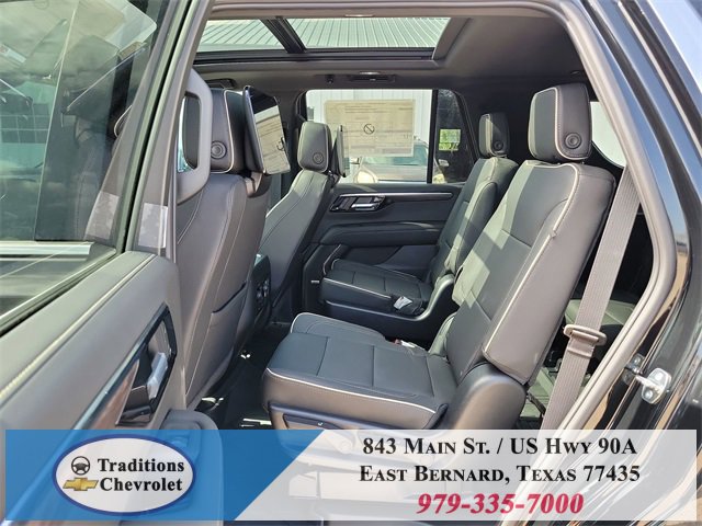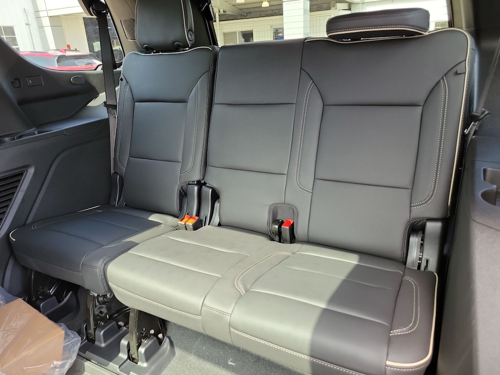 Advanced Security Package (Glass Breakage Sensor, Theft-Deterrent Alarm System, Vehicle Inclination Sensor, and Vehicle Interior Movement Sensor), Advanced Trailering Package (Smart Trailer Integration Indicator), Preferred Equipment Group 1LZ (3-Spoke Wrapped Steering Wheel, 3rd Row 60/40 Power-Folding Split-Bench Seat, Auto-Dimming Inside Rear-View Mirror, Chrome Mirror Caps, Color-Keyed Carpeting Floor Covering, Dual Exhaust System, Floor Console, Front LED Fog Lamps, Heated 2nd Row Outboard Seats, Heated Steering Wheel, LED Tail Lamps, Memory Settings, Outside Heated Power-Adjustable Mirrors, Power Release 2nd Row Bucket Seats, Rear Power Liftgate, Remote Start, Universal Home Remote, Wireless Phone Charging, 20 x 9 Polished Aluminum Wheels, Front Bucket Seats, and Magnetic Ride Control Suspension), License Plate Front Mounting Package, Max Trailering Package (Integrated Trailer Brake Controller), Technology & Entertainment Package (Dual-Pane Power Panoramic Sunroof and Rear Seat Media System), Technology Package (15 Diagonal Multi-Color Head-Up Display and AutoSense Hands-Free Power Liftgate), Jet Black w/Perforated Leather Seat Trim, Navigation system: Google built-in compatibility (select service plan required, terms and limitations apply), 10 Speakers, 3.23 Rear Axle Ratio, 3rd row seats: split-bench, 4-Way Power Driver Lumbar Seat Adjuster, 4-Way Power Front Passenger Lumbar Seat Adjuster, 4-Wheel Disc Brakes, 8-Way Power Driver Seat Adjuster, 8-Way Power Front Passenger Seat Adjuster, ABS brakes, Adaptive suspension, Air Conditioning, Alloy wheels, AM/FM radio: SiriusXM with 360L, Apple CarPlay/Android Auto, Auto High-beam Headlights, Auto-dimming door mirrors, Auto-dimming Rear-View mirror, Auto-leveling suspension, Automatic temperature control, Brake assist, Bumpers: body-color, Compass, Delay-off headlights, Driver door bin, Driver vanity mirror, Dual front impact airbags, Dual front side impact airbags, Electronic Stability Control, Emergency communication system: OnStar and Chevrolet connected services capable, Exterior Parking Camera Rear, Extra Capacity Cooling System, Four wheel independent suspension, Front anti-roll bar, Front Center Armrest, Front dual zone A/C, Front fog lights, Front reading lights, Fully automatic headlights, Garage door transmitter, Heated door mirrors, Heated front seats, Heated rear seats, Heated steering wheel, Illuminated entry, Low tire pressure warning, Memory seat, Occupant sensing airbag, Outside temperature display, Overhead airbag, Overhead console, Panic alarm, Passenger door bin, Passenger vanity mirror, Perforated Leather Seat Trim, Power door mirrors, Power driver seat, Power Liftgate, Power passenger seat, Power steering, Power windows, Power-Retractable Assist Steps, Premium audio system: Chevrolet Infotainment 3 Premium, Radio data system, Radio: 17.7 Diagonal Advanced Color LCD Display, Rain sensing wipers, Rear air conditioning, Rear anti-roll bar, Rear reading lights, Rear window defroster, Rear window wiper, Remote keyless entry, Security system, Speed con