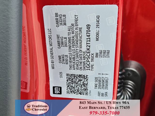Preferred Equipment Group 2LT (Automatic Emergency Braking, Chevy Safety Assist, Following Distance Indicator, Forward Collision Alert, Front Pedestrian and Bicyclist Braking, IntelliBeam Automatic High Beam on/Off, and Lane Keep Assist with Lane Departure Warning), 3.42 Rear Axle Ratio, 4-Way Manual Passenger Seat Adjuster, 4-Wheel Disc Brakes, 6 Speakers, 6-Speaker Audio System Feature, 8-Way Power Driver Seat Adjuster, ABS brakes, Air Conditioning, Alloy wheels, AM/FM radio: SiriusXM with 360L, Apple CarPlay/Android Auto, Auto High-beam Headlights, Auto-dimming Rear-View mirror, Automatic temperature control, Black Spray-on Bedliner, Brake assist, Bumpers: body-color, Cloth Seat Trim, Compass, Delay-off headlights, Driver and Front Passenger Heated Seats, Driver door bin, Driver vanity mirror, Dual front impact airbags, Dual front side impact airbags, Electronic Stability Control, Emergency communication system: OnStar, Front anti-roll bar, Front Bucket Seats, Front Center Armrest, Front dual zone A/C, Front License Plate Kit, Front Passenger Seatback Map Pocket, Front reading lights, Front wheel independent suspension, Heated door mirrors, Heated front seats, Illuminated entry, Low tire pressure warning, Navigation System, Occupant sensing airbag, Outside temperature display, Overhead airbag, Overhead console, Panic alarm, Passenger door bin, Passenger vanity mirror, Power door mirrors, Power Driver Lumbar Control Seat Adjuster, Power driver seat, Power steering, Power windows, Radio data system, Radio: 11.3 Diagonal Advanced Color LCD Display, Rear reading lights, Rear step bumper, Rear window defroster, Remote keyless entry, Security system, SiriusXM with 360L Trial Subscription, Speed control, Speed-sensing steering, Split folding rear seat, Steering Wheel Mounted Audio Controls, Steering wheel mounted audio controls, Tachometer, Telescoping steering wheel, Tilt steering wheel, Traction control, Trip computer, Variably intermittent wipers, Wheels: 17 x 8 Argent Metallic Aluminum, and Wireless Phone Projection. Tax, title, license and dealer fees (unless itemized above) are extra. Not available with special finance or lease offers. See Dealer for Details. Price includes: $1000 - Customer Cash. Exp. 03/02/2026