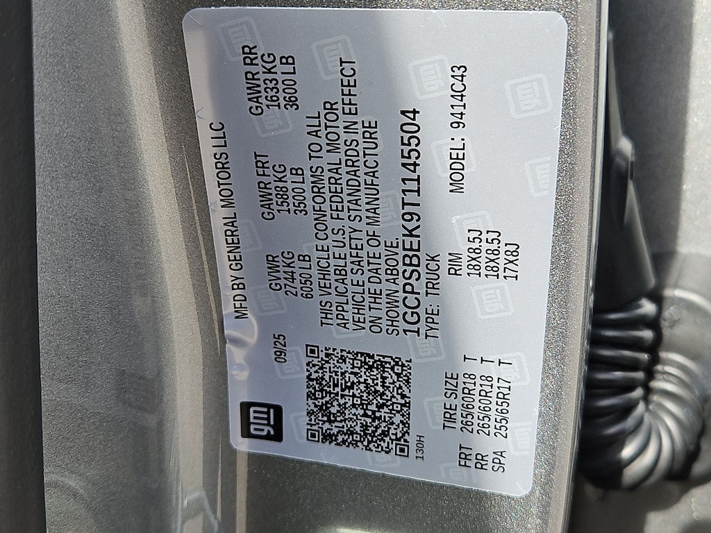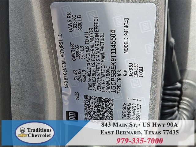 Preferred Equipment Group 2WT (Automatic Emergency Braking, Chevy Safety Assist, Following Distance Indicator, Forward Collision Alert, Front Pedestrian & Bicyclist Braking, IntelliBeam Automatic High Beam On/Off, and Lane Keep Assist w/Lane Departure Warning), WT Convenience Package II (4-Spoke Wrapped Steering Wheel, 8-Way Power Driver Seat Adjuster, EZ-Lift & Lower Tailgate, Power Driver Lumbar Control Seat Adjuster, StowFlex Tailgate Storage Compartment, and Tailgate Keyed Cylinder Lock), WT Custom Package (Black Nameplates (LPO) and Wheels: 18 x 8.5 Black High Gloss Aluminum), 3.42 Rear Axle Ratio, 4-Way Manual Passenger Seat Adjuster, 4-Wheel Disc Brakes, 6 Speakers, 6-Speaker Audio System Feature, 6-Way Manual Driver Seat Adjuster, ABS brakes, Air Conditioning, AM/FM radio: SiriusXM with 360L, Apple CarPlay/Android Auto, Auto High-beam Headlights, Brake assist, Cloth Seat Trim, Delay-off headlights, Driver door bin, Driver vanity mirror, Dual front impact airbags, Dual front side impact airbags, Electronic Stability Control, Emergency communication system: OnStar, Front anti-roll bar, Front Bucket Seats, Front Center Armrest, Front License Plate Kit, Front wheel independent suspension, Heated door mirrors, Low tire pressure warning, Navigation System, Occupant sensing airbag, Overhead airbag, Panic alarm, Passenger door bin, Passenger vanity mirror, Power door mirrors, Power steering, Power windows, Radio data system, Radio: 11.3 Diagonal Advanced Color LCD Display, Rear step bumper, Rear window defroster, Remote keyless entry, Remote Start Kit w/2 Key Fobs (LPO), Security system, SiriusXM w/360L Trial Subscription, Speed control, Speed-sensing steering, Split folding rear seat, Steering Wheel Mounted Audio Controls, Steering wheel mounted audio controls, Tachometer, Tilt steering wheel, Traction control, Trip computer, Variably intermittent wipers, Wheels: 17 x 8 Ultra Silver Metallic Steel, and Wireless Phone Projection. Tax, title, license and dealer fees (unless itemized above) are extra. Not available with special finance or lease offers. See Dealer for Details. Price includes: $1000 - Customer Cash. Exp. 12/01/2025