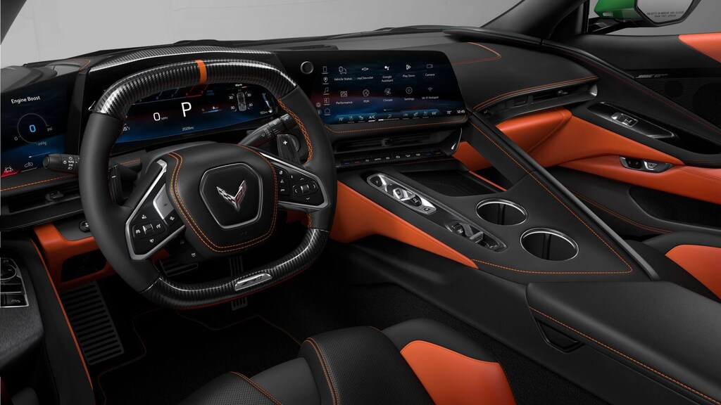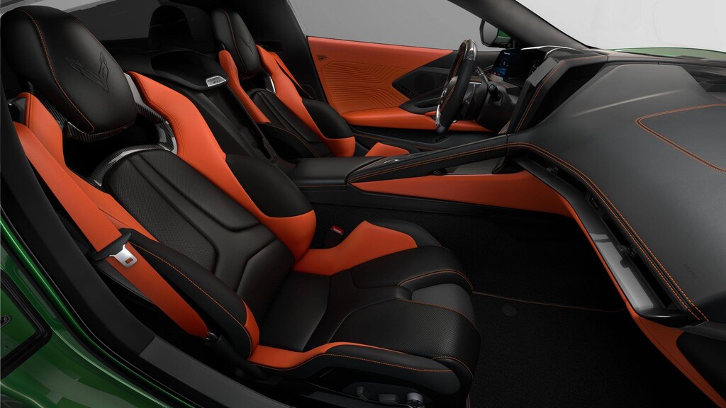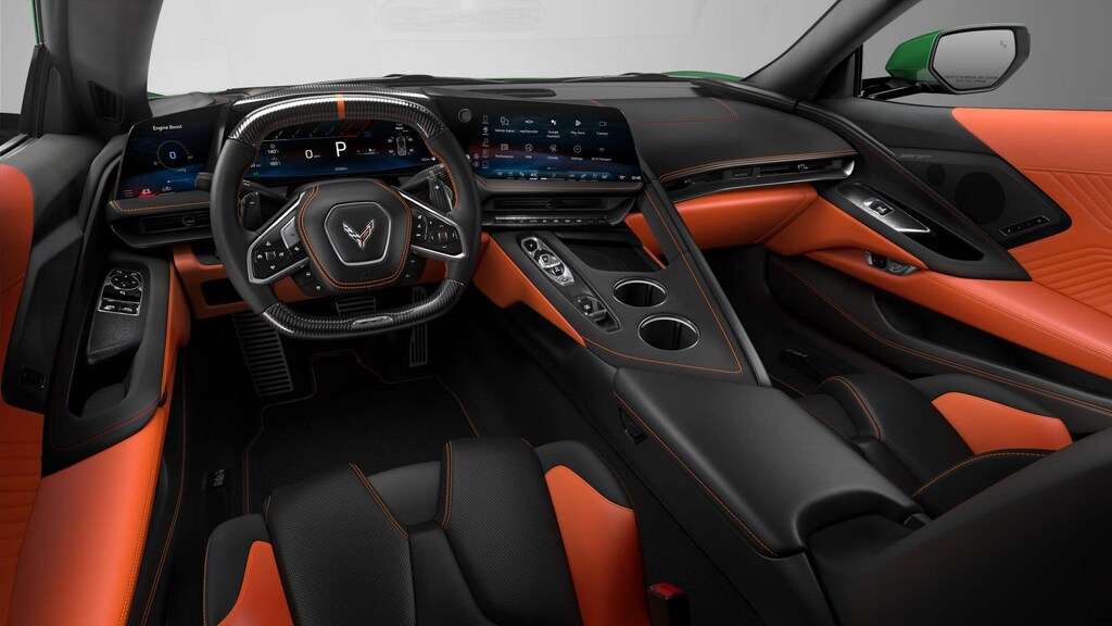 Custom Leather Wrapped Interior Package, Memory Driver and Passenger Convenience Package, Stealth Interior Trim Package, Sueded Microfiber-Wrapped Upper Interior Trim Package, ZR1 Carbon Fiber Aero Package, 14 Speakers, 2 Cargo Nets, 4-Wheel Disc Brakes, 8-Way Power Driver Seat Adjuster, 8-Way Power Passenger Seat Adjuster, ABS brakes, Adaptive suspension, Air Conditioning, Alloy wheels, AM/FM radio: SiriusXM, Auto High-beam Headlights, Auto-dimming door mirrors, Auto-dimming Rear-View mirror, Automatic Leveling System Headlamp Control, Automatic temperature control, Black Exhaust Tips, Black Lug Nuts, Black Wheel Locks, Bose Performance Series Sound System with 14 Speakers, Brake assist, Bumpers: body-color, Carbon Flash with Orange Accent Dual Racing Stripes, Ceramic disc brakes: front and rear, Compass, Competition Sport Bucket Seats, Delay-off headlights, Driver door bin, Driver Power Bolster Seat Adjuster, Driver vanity mirror, Dual front impact airbags, Dual front side impact airbags, Electrical Theft Deterrent System, Electronic Stability Control, Emergency communication system: OnStar and Chevrolet connected services capable, Exterior Parking Camera Rear, Four wheel independent suspension, Front anti-roll bar, Front Bucket Seats, Front Center Armrest, Front dual zone A/C, Front Lift Adjustable Height with Memory, Front reading lights, Fully automatic headlights, Garage door transmitter, GT2 Bucket Seats, HD Front and Rear Vision Cameras, Heads-Up Display, Heated and Vented Driver and Passenger Seats, Heated door mirrors, Heated front seats, Heated Steering Wheel, Heated steering wheel, Illuminated entry, Jake Logo Wheel Center Caps, Leather Shift Knob, Leather steering wheel, Low tire pressure warning, Memory seat, Napa Leather Seating Surfaces with Perforated Inserts, Navigation System, Occupant sensing airbag, Orange-Painted Calipers, Outside temperature display, Overhead console, Painted Body-Color Carbon Fiber Split Window Trim, Panic alarm, Passenger door bin, Passenger Power Bolster Seat Adjuster, Passenger vanity mirror, Power door mirrors, Power Driver Lumbar Control Seat Adjuster, Power driver seat, Power Passenger Lumbar Control Seat Adjuster, Power passenger seat, Power steering, Power windows, Power-Adjustable Outside Heated Mirrors, Premium audio system: Chevrolet Infotainment 3 Premium, Radio data system, Radio: Infotainment System with Google Built-in, Rear anti-roll bar, Rear Cross Traffic Alert, Rear window defroster, Remote keyless entry, Roof Panel Storage Pouch, Security system, Side Blind Zone Alert, Speed control, Speed-sensing steering, Spoiler, Sport steering wheel, Steering wheel memory, Steering wheel mounted audio controls, Tachometer, Telescoping steering wheel, Tilt steering wheel, Traction control, Trip computer, Turn signal indicator mirrors, Universal Home Remote, Variably intermittent wipers, Vehicle Inclination Theft Deterrent Sensor, Vehicle Interior Movement Theft Deterrent Sensor, Ventilated front seats, Voltmeter, Wheels: 20 x 10 Front and 21 x 13 Rear Carbon Flash, Wheels: 20 x 10 Front and 21 x 13 Rear Sterling Silver, and Wireless Phone Charging.