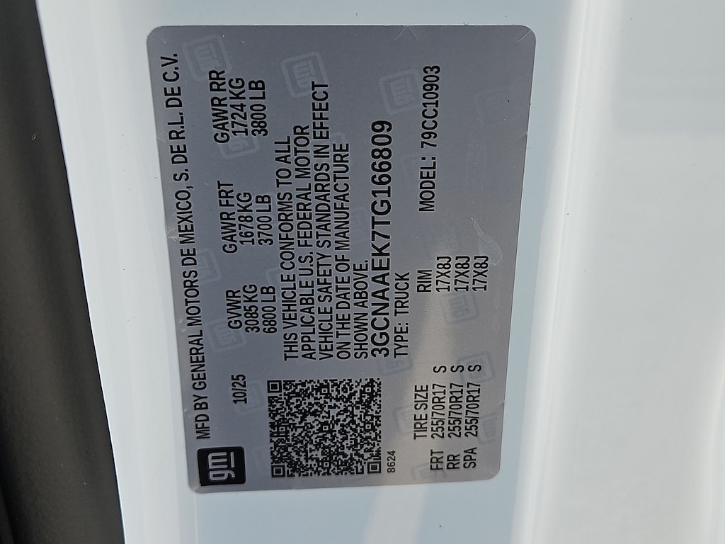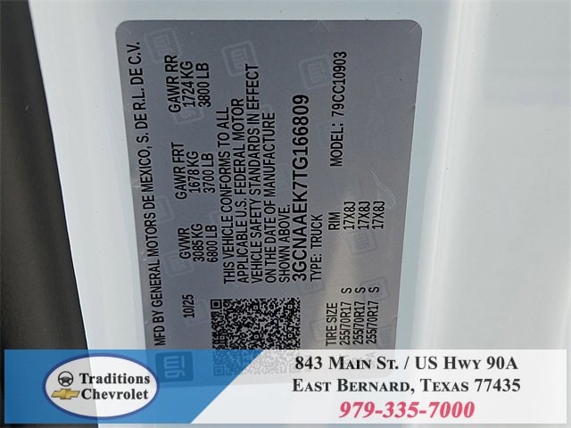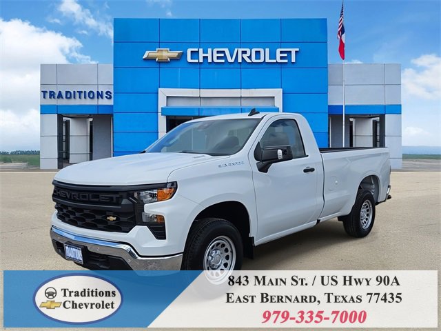 Standard Suspension Package, Trailering Package (Hitch Guidance), WT Convenience Package (Deep-Tinted Glass and Electric Rear-Window Defogger), WT Safety Package (Front Chrome Bumper, High Gloss Black Mirror Caps, Lane Change Alert with Side Blind Zone Alert, Perimeter Lighting, Rear Chrome Bumper, Rear Cross Traffic Braking, Rear Pedestrian Alert, and Ultrasonic Front and Rear Park Assist), WT Value Package, 8-Speed Automatic, H2g Jet Black Vinyl, 120-Volt Bed Mounted Power Outlet, 120-Volt Interior Power Outlet, 2 Speakers, 2-Speaker Audio System, 220 Amp Alternator, 3.42 Rear Axle Ratio, 3.5 Monochromatic Display Driver Info Center, 4-Way Manual Driver Seat Adjuster, 4-Wheel Disc Brakes, 40/20/40 Front Split Bench Seat, ABS brakes, Air Conditioning, Apple CarPlay/Android Auto, Auto High-beam Headlights, Automatic Emergency Braking, Black (Semi-Gloss) Front Bumper, Black (Semi-Gloss) Rear Bumper, Bluetooth® For Phone, Brake assist, Chevytec Spray-on Black Bedliner, Compass, Delay-off headlights, Driver door bin, Dual front impact airbags, Dual front side impact airbags, Electronic Cruise Control, Electronic Stability Control, Emergency communication system: OnStar, EZ Lift Power Lock and Release Tailgate, Following Distance Indicator, Forward Collision Alert, Front anti-roll bar, Front Center Armrest w/Storage, Front Frame-Mounted Black Recovery Hooks, Front Pedestrian Braking, Front reading lights, Front wheel independent suspension, Fully automatic headlights, HD Rear Vision Camera, Heated door mirrors, Heated Power-Adjustable Outside Mirrors, Illuminated entry, Inside Rearview Mirror with Tilt, IntelliBeam Automatic High Beam on/Off, Lane Keep Assist with Lane Departure Warning, Locking Tailgate, Low tire pressure warning, Manual Tailgate Function with No EZ Lift, Manual Tilt Wheel Steering Column, Occupant sensing airbag, OnStar Services Capable, Outside temperature display, Overhead airbag, Overhead console, Panic alarm, Passenger door bin, Passenger vanity mirror, Power door mirrors, Power Front Windows with Driver Express Up/Down, Power steering, Power windows, Premium audio system: Chevrolet Infotainment 3, Radio data system, Radio: Chevrolet Infotainment 3 System, Rear reading lights, Rear step bumper, Remote Keyless Entry, Remote keyless entry, Rubberized-Vinyl Floor Covering, SiriusXM Delete, Solar Absorbing Tinted Glass, Speed control, Speed-sensing steering, Standard Tailgate, Tachometer, Teen Driver, Tilt steering wheel, Tire Pressure Monitoring System, Traction control, Trip computer, Variably intermittent wipers, Vinyl Seat Trim, Voltmeter, Wheels: 17 x 8 Ultra Silver Painted Steel, and Wi-Fi Hot Spot Capable. Tax, title, license and dealer fees (unless itemized above) are extra. Not available with special finance or lease offers. See Dealer for Details. Price includes: $1000 - Bonus Cash. Exp. 01/02/2026 $3000 - Customer Cash. Exp. 01/02/2026