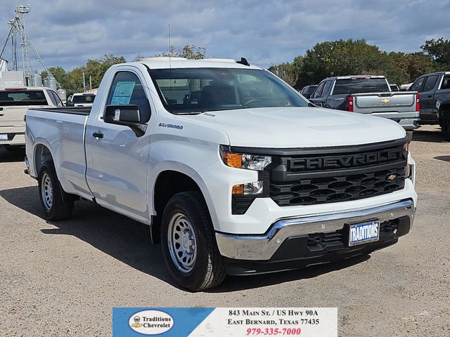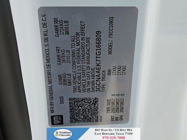 8-Speed Automatic, Jet Black Vinyl.Preferred Equipment Group 1WT (3.5 Monochromatic Display Driver Info Center, 4-Way Manual Driver Seat Adjuster, 40/20/40 Front Split Bench Seat, Black (Semi-Gloss) Front Bumper, Black (Semi-Gloss) Rear Bumper, Bluetooth® For Phone, Electronic Cruise Control, Front Frame-Mounted Black Recovery Hooks, HD Rear Vision Camera, Heated Power-Adjustable Outside Mirrors, Inside Rearview Mirror with Tilt, Locking Tailgate, Manual Tailgate Function with No EZ Lift, Manual Tilt Wheel Steering Column, OnStar Services Capable, Power Front Windows with Driver Express Up/Down, Power Front Windows with Passenger Express Down, Remote Keyless Entry, Rubberized-Vinyl Floor Covering, SiriusXM Delete, Solar Absorbing Tinted Glass, Standard Tailgate, Teen Driver, Tire Pressure Monitoring System, Vinyl Seat Trim, Wheels: 17 x 8 Ultra Silver Painted Steel, and Wi-Fi Hot Spot Capable), Standard Suspension Package, Trailering Package (Hitch Guidance), WT Convenience Package (Deep-Tinted Glass and Electric Rear-Window Defogger), WT Safety Package (Front Chrome Bumper, High Gloss Black Mirror Caps, Lane Change Alert with Side Blind Zone Alert, Perimeter Lighting, Rear Chrome Bumper, Rear Cross Traffic Braking, Rear Pedestrian Alert, and Ultrasonic Front and Rear Park Assist), WT Value Package, 8-Speed Automatic, Jet Black Vinyl, 120-Volt Bed Mounted Power Outlet, 120-Volt Interior Power Outlet, 2 Speakers, 2-Speaker Audio System, 220 Amp Alternator, 3.42 Rear Axle Ratio, 4-Wheel Disc Brakes, ABS brakes, Air Conditioning, Apple CarPlay/Android Auto, Auto High-beam Headlights, Automatic Emergency Braking, Brake assist, Chevytec Spray-on Black Bedliner, Compass, Delay-off headlights, Driver door bin, Dual front impact airbags, Dual front side impact airbags, Electronic Stability Control, Emergency communication system: OnStar, EZ Lift Power Lock and Release Tailgate, Following Distance Indicator, Forward Collision Alert, Front anti-roll bar, Front Center Armrest w/Storage, Front License Plate Kit, Front Pedestrian Braking, Front reading lights, Front wheel independent suspension, Fully automatic headlights, Heated door mirrors, Illuminated entry, IntelliBeam Automatic High Beam on/Off, Lane Keep Assist with Lane Departure Warning, Low tire pressure warning, Occupant sensing airbag, Outside temperature display, Overhead airbag, Overhead console, Panic alarm, Passenger door bin, Passenger vanity mirror, Power door mirrors, Power steering, Power windows, Premium audio system: Chevrolet Infotainment 3, Radio data system, Radio: Chevrolet Infotainment 3 System, Rear reading lights, Rear step bumper, Remote keyless entry, Speed control, Speed-sensing steering, Tachometer, Tilt steering wheel, Traction control, Trip computer, Variably intermittent wipers, and Voltmeter. Tax, title, license and dealer fees (unless itemized above) are extra. Not available with special finance or lease offers. See Dealer for Details. Price includes: $1000 - Bonus Cash. Exp. 03/02/2026 $3000 - Customer Cash. Exp. 03/02/2026