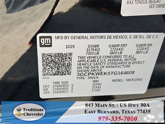 Convenience Package (10-Way Power Driver Seat w/Lumbar, 120-Volt Bed Mounted Power Outlet, 120-Volt Interior Power Outlet, Dual Rear USB Ports (Charge Only), Dual-Zone Automatic Climate Control, Electric Rear-Window Defogger, Heated Driver & Front Outboard Passenger Seats, Heated Steering Wheel, Keyless Open & Start, LED Cargo Area Lighting, Manual Tilt/Telescoping Steering Column, Remote Vehicle Starter System, Theft Deterrent System (Unauthorized Entry), and Wrapped Steering Wheel), High Capacity Suspension Package, RST Select Package (4 Black Round Assist Steps (LPO), All-Weather Floor Liner (LPO), Chevytec Spray-On Black Bedliner, and Wheels: 20 x 9 High Gloss Black Painted Alum), Standard Suspension Package, Trailering Package (Hitch Guidance), 8-Speed Automatic, 4WD, Jet Black Premium Cloth, 12.3 Multicolor Reconfigurable Digital Display, 220 Amp Alternator, 3.42 Rear Axle Ratio, 4-Wheel Disc Brakes, 40/20/40 Front Split-Bench Seat, 6 Speakers, 6-Speaker Audio System, ABS brakes, Air Conditioning, All-Star Edition, Alloy wheels, AM/FM radio: SiriusXM with 360L, Apple CarPlay/Android Auto, Auto High-beam Headlights, Auto-Locking Rear Differential, Automatic Emergency Braking, Automatic temperature control, Bluetooth® For Phone, Brake assist, Bumpers: body-color, Cloth Seat Trim, Color-Keyed Carpeting Floor Covering, Compass, Deep-Tinted Glass, Delay-off headlights, Driver door bin, Driver vanity mirror, Dual front impact airbags, Dual front side impact airbags, Electronic Cruise Control, Electronic Stability Control, Emergency communication system: OnStar, EZ Lift Power Lock & Release Tailgate, Following Distance Indicator, Forward Collision Alert, Front anti-roll bar, Front Center Armrest w/Storage, Front dual zone A/C, Front fog lights, Front Frame-Mounted Black Recovery Hooks, Front LED Fog Lamps, Front Pedestrian Braking, Front reading lights, Front Rubberized Vinyl Floor Mats, Front wheel independent suspension, Fully automatic headlights, HD Rear Vision Camera, Heated door mirrors, Heated front seats, Heated Power-Adjustable Outside Mirrors, Heated steering wheel, High Gloss Black Mirror Caps, Illuminated entry, Inside Rear-View Mirror w/Tilt, Integrated Trailer Brake Controller, IntelliBeam Automatic High Beam On/Off, Lane Keep Assist w/Lane Departure Warning, Low tire pressure warning, Occupant sensing airbag, OnStar Services Capable, Outside temperature display, Overhead airbag, Overhead console, Panic alarm, Passenger door bin, Passenger vanity mirror, Power door mirrors, Power driver seat, Power Front Windows w/Driver Express Up/Down, Power Front Windows w/Passenger Express Down, Power Rear Windows w/Express Down, Power steering, Power windows, Premium audio system: Chevrolet Infotainment 3 Premium, Radio data system, Radio: Chevrolet Infotainment 3 Premium System, Rear 60/40 Folding Bench Seat (Folds Up), Rear reading lights, Rear Rubberized-Vinyl Floor Mats, Rear step bumper, Rear window defroster, Remote keyless entry, Security system, Single Outlet Exhaust, SiriusXM w/360L Trial Subscription, Speed control, Speed-sensing steering, Split folding rear seat, Standard Tailgate, Steering Wheel Audio Controls, Steering wheel mounted audio controls, Tachometer, Teen Driver, Telescoping steering wheel, Tilt steering wheel, Tire Pressure Monitoring System, Traction control, Trip computer, Variably intermittent wipers, Voltmeter, Wheels: 18 x 8.5 Bright Silver Painted Aluminum, and Wi-Fi Hot Spot Capable. Tax, title, license and dealer fees (unless itemized above) are extra. Not available with special finance or lease offers. See Dealer for Details. Price includes: $1000 - Bonus Cash. Exp. 01/02/2026 $3000 - Customer Cash. Exp. 01/02/2026