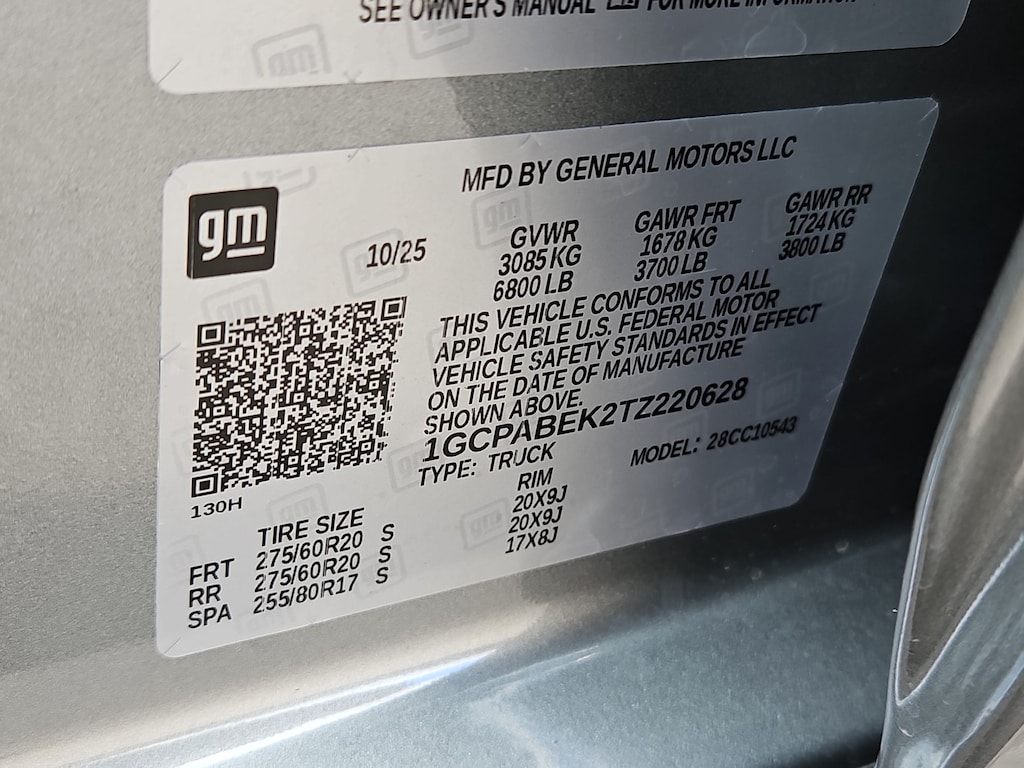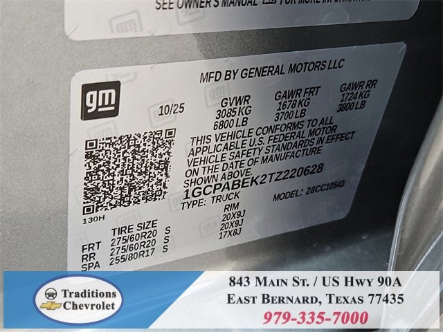 Custom Convenience Package (Electric Rear-Window Defogger, EZ Lift Power Lock and Release Tailgate, LED Cargo Area Lighting, Remote Vehicle Starter System, and Theft Deterrent System (unauthorized Entry)), Custom Value Package, Dark Essentials Package (Black Name Plates and Front Black Bowtie Emblem), High Capacity Suspension Package, Trailering Package (Hitch Guidance), 8-Speed Automatic, Jet Black Premium Cloth, 10-Way Power Driver Seat with Lumbar, 120-Volt Bed Mounted Power Outlet, 120-Volt Interior Power Outlet, 3.42 Rear Axle Ratio, 3.5 Monochromatic Display Driver Info Center, 4-Wheel Disc Brakes, 4 Black Round Assist Steps, 40/20/40 Front Split-Bench Seat, 6 Speakers, 6-Speaker Audio System, ABS brakes, Air Conditioning, All-Weather Floor Liner, Alloy wheels, AM/FM radio: SiriusXM, Apple CarPlay/Android Auto, Auto High-beam Headlights, Automatic Emergency Braking, Bluetooth® For Phone, Brake assist, Bumpers: body-color, Chevytec Spray-on Black Bedliner, Cloth Seat Trim, Color-Keyed Carpeting Floor Covering, Compass, Deep-Tinted Glass, Delay-off headlights, Driver door bin, Driver vanity mirror, Dual front impact airbags, Dual front side impact airbags, Dual Rear USB Ports (charge Only), Electronic Cruise Control, Electronic Stability Control, Emergency communication system: OnStar, Following Distance Indicator, Forward Collision Alert, Front anti-roll bar, Front Center Armrest w/Storage, Front Frame-Mounted Black Recovery Hooks, Front Pedestrian Braking, Front reading lights, Front Rubberized Vinyl Floor Mats, Front wheel independent suspension, Fully automatic headlights, HD Rear Vision Camera, Heated door mirrors, Illuminated entry, IntelliBeam Automatic High Beam on/Off, Lane Keep Assist with Lane Departure Warning, Low tire pressure warning, Manual Tilt Wheel Steering Column, Multi-Flex Tailgate, Occupant sensing airbag, OnStar Services Capable, Outside temperature display, Overhead airbag, Overhead console, Panic alarm, Passenger door bin, Passenger vanity mirror, Power door mirrors, Power driver seat, Power Front Windows with Driver Express Up/Down, Power Front Windows with Passenger Express Down, Power Rear Windows with Express Down, Power steering, Power windows, Premium audio system: Chevrolet Infotainment 3, Radio data system, Radio: Chevrolet Infotainment 3 System, Rear 60/40 Folding Bench Seat (folds Up), Rear reading lights, Rear Rubberized-Vinyl Floor Mats, Rear step bumper, Rear Wheelhouse Liners, Rear window defroster, Remote Keyless Entry, Remote keyless entry, Security system, SiriusXM Trial Subscription, Speed control, Speed-sensing steering, Split folding rear seat, Standard Tailgate, Tachometer, Teen Driver, Tilt steering wheel, Tire Pressure Monitoring System, Traction control, Trip computer, Variably intermittent wipers, Voltmeter, Wheels: 20 x 9 Bright Silver Painted Aluminum, Wheels: 20 x 9 High Gloss Black Painted Aluminum, and Wi-Fi Hot Spot Capable. Tax, title, license and dealer fees (unless itemized above) are extra. Not available with special finance or lease offers. See Dealer for Details. Price includes: $1000 - Bonus Cash. Exp. 01/02/2026 $3000 - Customer Cash. Exp. 01/02/2026