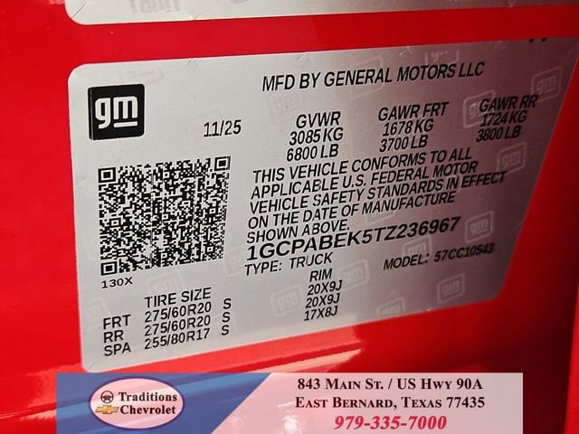 Custom Convenience Package (Electric Rear-Window Defogger, EZ Lift Power Lock and Release Tailgate, LED Cargo Area Lighting, Remote Vehicle Starter System, and Theft Deterrent System (unauthorized Entry)), Custom Value Package, Dark Essentials Package (Black Name Plates and Front Black Bowtie Emblem), High Capacity Suspension Package, Trailering Package (Hitch Guidance), Turbomax Blackout Package (4 Black Round Assist Steps, Black Chrome Exhaust Tip, and Wheels: 20 x 9 High Gloss Black Painted Aluminum), 8-Speed Automatic, Jet Black Cloth, 10-Way Power Driver Seat with Lumbar, 120-Volt Bed Mounted Power Outlet, 120-Volt Interior Power Outlet, 3.42 Rear Axle Ratio, 3.5 Monochromatic Display Driver Info Center, 4-Wheel Disc Brakes, 40/20/40 Front Split-Bench Seat, 6 Speakers, 6-Speaker Audio System, ABS brakes, Air Conditioning, Alloy wheels, AM/FM radio: SiriusXM, Apple CarPlay/Android Auto, Auto High-beam Headlights, Automatic Emergency Braking, Bluetooth® For Phone, Brake assist, Bumpers: body-color, Chevytec Spray-on Black Bedliner, Cloth Seat Trim, Color-Keyed Carpeting Floor Covering, Compass, Deep-Tinted Glass, Delay-off headlights, Driver door bin, Driver vanity mirror, Dual front impact airbags, Dual front side impact airbags, Dual Rear USB Ports (charge Only), Electronic Cruise Control, Electronic Stability Control, Emergency communication system: OnStar, Following Distance Indicator, Forward Collision Alert, Front anti-roll bar, Front Center Armrest w/Storage, Front Frame-Mounted Black Recovery Hooks, Front Pedestrian Braking, Front reading lights, Front Rubberized Vinyl Floor Mats, Front wheel independent suspension, Fully automatic headlights, HD Rear Vision Camera, Heated door mirrors, Illuminated entry, IntelliBeam Automatic High Beam on/Off, Lane Keep Assist with Lane Departure Warning, Low tire pressure warning, Manual Tilt Wheel Steering Column, Multi-Flex Tailgate, Occupant sensing airbag, OnStar Services Capable, Outside temperature display, Overhead airbag, Overhead console, Panic alarm, Passenger door bin, Passenger vanity mirror, Power door mirrors, Power driver seat, Power Front Windows with Driver Express Up/Down, Power Front Windows with Passenger Express Down, Power Rear Windows with Express Down, Power steering, Power windows, Premium audio system: Chevrolet Infotainment 3, Radio data system, Radio: Chevrolet Infotainment 3 System, Rear 60/40 Folding Bench Seat (folds Up), Rear reading lights, Rear Rubberized-Vinyl Floor Mats, Rear step bumper, Rear Wheelhouse Liners, Rear window defroster, Remote Keyless Entry, Remote keyless entry, Security system, SiriusXM Trial Subscription, Speed control, Speed-sensing steering, Split folding rear seat, Standard Tailgate, Tachometer, Teen Driver, Tilt steering wheel, Tire Pressure Monitoring System, Traction control, Trip computer, Variably intermittent wipers, Voltmeter, Wheels: 20 x 9 Bright Silver Painted Aluminum, and Wi-Fi Hot Spot Capable. Tax, title, license and dealer fees (unless itemized above) are extra. Not available with special finance or lease offers. See Dealer for Details. Price includes: $1000 - Bonus Cash. Exp. 03/02/2026 $3000 - Customer Cash. Exp. 03/02/2026
