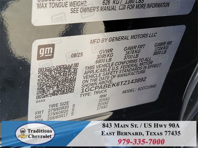 Custom Convenience Package (Electric Rear-Window Defogger, EZ Lift Power Lock & Release Tailgate, LED Cargo Area Lighting, Remote Vehicle Starter System, and Theft Deterrent System (Unauthorized Entry)), Custom Value Package, High Capacity Suspension Package, Preferred Equipment Group 1CX (10-Way Power Driver Seat w/Lumbar, 120-Volt Bed Mounted Power Outlet, 120-Volt Interior Power Outlet, 3.5 Monochromatic Display Driver Info Center, Bluetooth® For Phone, Color-Keyed Carpeting Floor Covering, Deep-Tinted Glass, Dual Rear USB Ports (Charge Only), Electronic Cruise Control, Front Frame-Mounted Black Recovery Hooks, Front Rubberized Vinyl Floor Mats, HD Rear Vision Camera, Manual Tilt Wheel Steering Column, OnStar Services Capable, Power Front Windows w/Driver Express Up/Down, Power Front Windows w/Passenger Express Down, Power Rear Windows w/Express Down, Rear 60/40 Folding Bench Seat (Folds Up), Rear Rubberized-Vinyl Floor Mats, Remote Keyless Entry, SiriusXM Trial Subscription, Standard Tailgate, Teen Driver, Tire Pressure Monitoring System, and Wi-Fi Hot Spot Capable), Trailering Package (Hitch Guidance), 8-Speed Automatic, Jet Black Cloth, 3.42 Rear Axle Ratio, 4-Wheel Disc Brakes, 40/20/40 Front Split-Bench Seat, 6 Speakers, 6-Speaker Audio System, ABS brakes, Air Conditioning, Alloy wheels, AM/FM radio: SiriusXM, Apple CarPlay/Android Auto, Auto High-beam Headlights, Automatic Emergency Braking, Brake assist, Bumpers: body-color, Chevytec Spray-On Black Bedliner, Cloth Seat Trim, Compass, Delay-off headlights, Driver door bin, Driver vanity mirror, Dual front impact airbags, Dual front side impact airbags, Electronic Stability Control, Emergency communication system: OnStar, Following Distance Indicator, Forward Collision Alert, Front anti-roll bar, Front Center Armrest w/Storage, Front License Plate Kit, Front Pedestrian Braking, Front reading lights, Front wheel independent suspension, Fully automatic headlights, Heated door mirrors, Illuminated entry, IntelliBeam Automatic High Beam On/Off, Lane Keep Assist w/Lane Departure Warning, Low tire pressure warning, Multi-Flex Tailgate, Occupant sensing airbag, Outside temperature display, Overhead airbag, Overhead console, Panic alarm, Passenger door bin, Passenger vanity mirror, Power door mirrors, Power driver seat, Power steering, Power windows, Premium audio system: Chevrolet Infotainment 3, Radio data system, Radio: Chevrolet Infotainment 3 System, Rear reading lights, Rear step bumper, Rear window defroster, Remote keyless entry, Security system, Speed control, Speed-sensing steering, Split folding rear seat, Tachometer, Tilt steering wheel, Traction control, Trip computer, Variably intermittent wipers, Voltmeter, Wheels: 20 x 9 Bright Silver Painted Aluminum, and Wheels: 20 x 9 High Gloss Black Painted Alum. Tax, title, license and dealer fees (unless itemized above) are extra. Not available with special finance or lease offers. See Dealer for Details. Price includes: $1000 - Bonus Cash. Exp. 12/01/2025 $1750 - Customer Cash. Exp. 12/01/2025