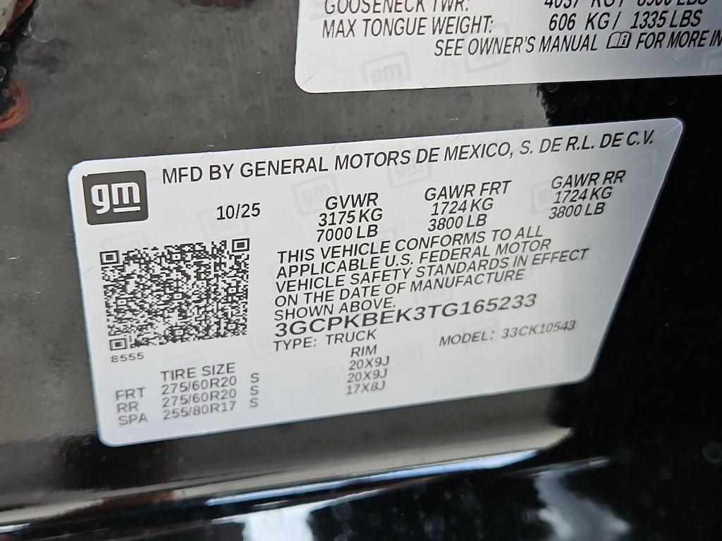 Custom Convenience Package (Electric Rear-Window Defogger, EZ Lift Power Lock & Release Tailgate, LED Cargo Area Lighting, Remote Vehicle Starter System, and Theft Deterrent System (Unauthorized Entry)), Custom Value Package, Dark Essentials Package (LPO) (Black Name Plates (LPO)), High Capacity Suspension Package, Trailering Package (Hitch Guidance), 8-Speed Automatic, 4WD, Jet Black Premium Cloth, 10-Way Power Driver Seat w/Lumbar, 120-Volt Bed Mounted Power Outlet, 120-Volt Interior Power Outlet, 3.42 Rear Axle Ratio, 3.5 Monochromatic Display Driver Info Center, 4-Wheel Disc Brakes, 40/20/40 Front Split-Bench Seat, 6 Speakers, 6-Speaker Audio System, ABS brakes, Air Conditioning, Alloy wheels, AM/FM radio: SiriusXM, Apple CarPlay/Android Auto, Auto High-beam Headlights, Automatic Emergency Braking, Bluetooth® For Phone, Brake assist, Bumpers: body-color, Chevytec Spray-On Black Bedliner, Cloth Seat Trim, Color-Keyed Carpeting Floor Covering, Compass, Deep-Tinted Glass, Delay-off headlights, Driver door bin, Driver vanity mirror, Dual front impact airbags, Dual front side impact airbags, Dual Rear USB Ports (Charge Only), Electronic Cruise Control, Electronic Stability Control, Emergency communication system: OnStar, Following Distance Indicator, Forward Collision Alert, Front anti-roll bar, Front Center Armrest w/Storage, Front Frame-Mounted Black Recovery Hooks, Front Pedestrian Braking, Front reading lights, Front Rubberized Vinyl Floor Mats, Front wheel independent suspension, Fully automatic headlights, HD Rear Vision Camera, Heated door mirrors, Illuminated entry, IntelliBeam Automatic High Beam On/Off, Lane Keep Assist w/Lane Departure Warning, Low tire pressure warning, Manual Tilt Wheel Steering Column, Multi-Flex Tailgate, Occupant sensing airbag, OnStar Services Capable, Outside temperature display, Overhead airbag, Overhead console, Panic alarm, Passenger door bin, Passenger vanity mirror, Power door mirrors, Power driver seat, Power Front Windows w/Driver Express Up/Down, Power Front Windows w/Passenger Express Down, Power Rear Windows w/Express Down, Power steering, Power windows, Premium audio system: Chevrolet Infotainment 3, Radio data system, Radio: Chevrolet Infotainment 3 System, Rear 60/40 Folding Bench Seat (Folds Up), Rear reading lights, Rear Rubberized-Vinyl Floor Mats, Rear step bumper, Rear window defroster, Remote Keyless Entry, Remote keyless entry, Security system, SiriusXM Trial Subscription, Speed control, Speed-sensing steering, Split folding rear seat, Standard Tailgate, Tachometer, Teen Driver, Tilt steering wheel, Tire Pressure Monitoring System, Traction control, Trip computer, Variably intermittent wipers, Voltmeter, Wheels: 20 x 9 Bright Silver Painted Aluminum, Wheels: 20 x 9 High Gloss Black Painted Alum, and Wi-Fi Hot Spot Capable. Tax, title, license and dealer fees (unless itemized above) are extra. Not available with special finance or lease offers. See Dealer for Details. Price includes: $1000 - Bonus Cash. Exp. 12/01/2025 $1750 - Customer Cash. Exp. 12/01/2025