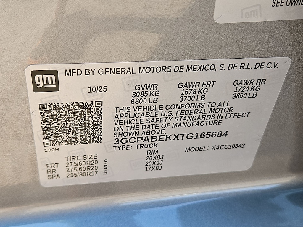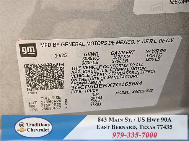 Custom Convenience Package (Electric Rear-Window Defogger, EZ Lift Power Lock and Release Tailgate, LED Cargo Area Lighting, Remote Vehicle Starter System, and Theft Deterrent System (unauthorized Entry)), Custom Value Package, High Capacity Suspension Package, Trailering Package (Hitch Guidance), 8-Speed Automatic, Jet Black Premium Cloth, 10-Way Power Driver Seat with Lumbar, 120-Volt Bed Mounted Power Outlet, 120-Volt Interior Power Outlet, 3.42 Rear Axle Ratio, 3.5 Monochromatic Display Driver Info Center, 4-Wheel Disc Brakes, 40/20/40 Front Split-Bench Seat, 6 Speakers, 6-Speaker Audio System, ABS brakes, Air Conditioning, Alloy wheels, AM/FM radio: SiriusXM, Apple CarPlay/Android Auto, Auto High-beam Headlights, Automatic Emergency Braking, Bluetooth® For Phone, Brake assist, Bumpers: body-color, Chevytec Spray-on Black Bedliner, Cloth Seat Trim, Color-Keyed Carpeting Floor Covering, Compass, Deep-Tinted Glass, Delay-off headlights, Driver door bin, Driver vanity mirror, Dual front impact airbags, Dual front side impact airbags, Dual Rear USB Ports (charge Only), Electronic Cruise Control, Electronic Stability Control, Emergency communication system: OnStar, Following Distance Indicator, Forward Collision Alert, Front anti-roll bar, Front Center Armrest w/Storage, Front Frame-Mounted Black Recovery Hooks, Front Pedestrian Braking, Front reading lights, Front Rubberized Vinyl Floor Mats, Front wheel independent suspension, Fully automatic headlights, HD Rear Vision Camera, Heated door mirrors, Illuminated entry, IntelliBeam Automatic High Beam on/Off, Lane Keep Assist with Lane Departure Warning, Low tire pressure warning, Manual Tilt Wheel Steering Column, Multi-Flex Tailgate, Occupant sensing airbag, OnStar Services Capable, Outside temperature display, Overhead airbag, Overhead console, Panic alarm, Passenger door bin, Passenger vanity mirror, Power door mirrors, Power driver seat, Power Front Windows with Driver Express Up/Down, Power Front Windows with Passenger Express Down, Power Rear Windows with Express Down, Power steering, Power windows, Premium audio system: Chevrolet Infotainment 3, Radio data system, Radio: Chevrolet Infotainment 3 System, Rear 60/40 Folding Bench Seat (folds Up), Rear reading lights, Rear Rubberized-Vinyl Floor Mats, Rear step bumper, Rear window defroster, Remote Keyless Entry, Remote keyless entry, Security system, SiriusXM Trial Subscription, Speed control, Speed-sensing steering, Split folding rear seat, Standard Tailgate, Tachometer, Teen Driver, Tilt steering wheel, Tire Pressure Monitoring System, Traction control, Trip computer, Variably intermittent wipers, Voltmeter, Wheels: 20 x 9 Bright Silver Painted Aluminum, Wheels: 20 x 9 High Gloss Black Painted Aluminum, and Wi-Fi Hot Spot Capable. Tax, title, license and dealer fees (unless itemized above) are extra. Not available with special finance or lease offers. See Dealer for Details. Price includes: $1000 - Bonus Cash. Exp. 12/01/2025 $1750 - Customer Cash. Exp. 12/01/2025