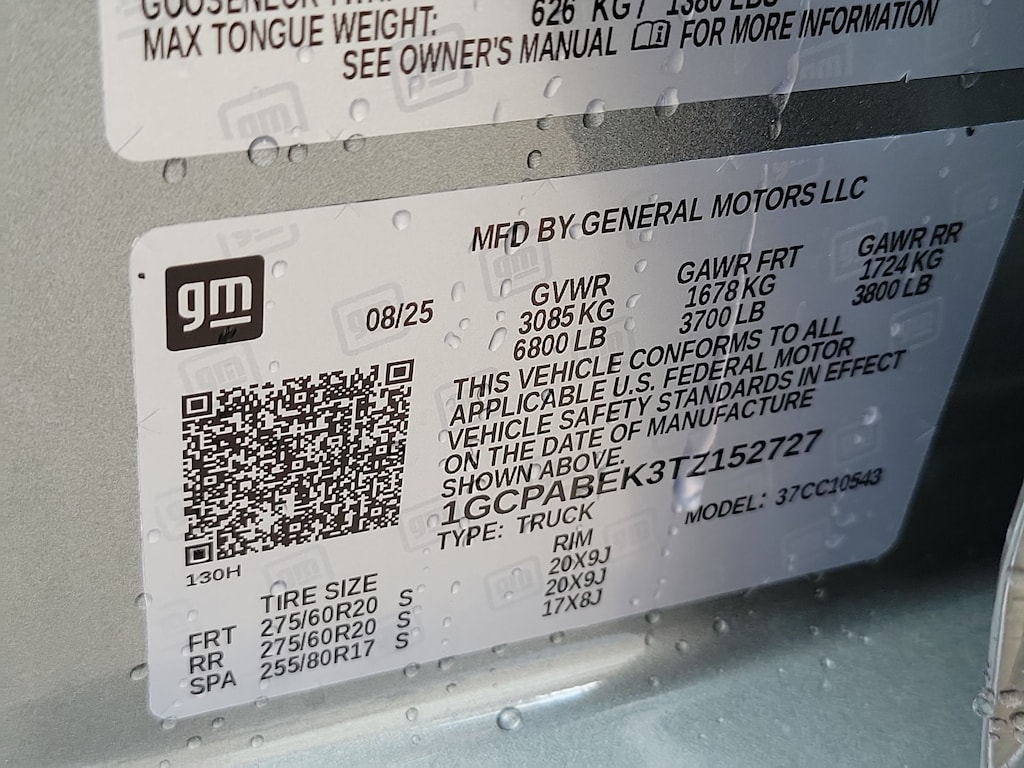 8-Speed Automatic, Black Cloth.Custom Convenience Package (Electric Rear-Window Defogger, LED Cargo Area Lighting, and Remote Vehicle Starter System), Custom Value Package, High Capacity Suspension Package, Preferred Equipment Group 1CX (120-Volt Bed Mounted Power Outlet, 120-Volt Interior Power Outlet, 3.5 Monochromatic Display Driver Info Center, 40/20/40 Front Split-Bench Seat, Bluetooth® For Phone, Cloth Seat Trim, Color-Keyed Carpeting Floor Covering, Deep-Tinted Glass, Electronic Cruise Control, Front Frame-Mounted Black Recovery Hooks, Front Rubberized Vinyl Floor Mats, HD Rear Vision Camera, Manual Tilt Wheel Steering Column, OnStar Services Capable, Rear Rubberized-Vinyl Floor Mats, Remote Keyless Entry, SiriusXM Trial Subscription, Standard Tailgate, Teen Driver, Tire Pressure Monitoring System, and Wi-Fi Hot Spot Capable), Trailering Package (Hitch Guidance), 8-Speed Automatic, Black Cloth, 3.42 Rear Axle Ratio, 4-Wheel Disc Brakes, 6 Speakers, 6-Speaker Audio System, ABS brakes, Air Conditioning, Alloy wheels, AM/FM radio: SiriusXM, Apple CarPlay/Android Auto, Auto High-beam Headlights, Automatic Emergency Braking, Brake assist, Bumpers: body-color, Compass, Delay-off headlights, Driver door bin, Driver vanity mirror, Dual front impact airbags, Dual front side impact airbags, Electronic Stability Control, Emergency communication system: OnStar, Following Distance Indicator, Forward Collision Alert, Front anti-roll bar, Front Center Armrest w/Storage, Front License Plate Kit, Front Pedestrian Braking, Front reading lights, Front wheel independent suspension, Fully automatic headlights, Heated door mirrors, Illuminated entry, Low tire pressure warning, Multi-Flex Tailgate, Occupant sensing airbag, Outside temperature display, Overhead airbag, Overhead console, Panic alarm, Passenger door bin, Passenger vanity mirror, Power door mirrors, Power driver seat, Power steering, Power windows, Premium audio system: Chevrolet Infotainment 3, Radio data system, Radio: Chevrolet Infotainment 3 System, Rear reading lights, Rear step bumper, Rear window defroster, Remote keyless entry, Security system, Speed control, Speed-sensing steering, Split folding rear seat, Tachometer, Tilt steering wheel, Traction control, Trip computer, Variably intermittent wipers, Voltmeter, and Wheels: 20 x 9 Bright Silver Painted Aluminum. Tax, title, license and dealer fees (unless itemized above) are extra. Not available with special finance or lease offers. See Dealer for Details. Price includes: $1000 - Bonus Cash. Exp. 12/01/2025 $1750 - Customer Cash. Exp. 12/01/2025