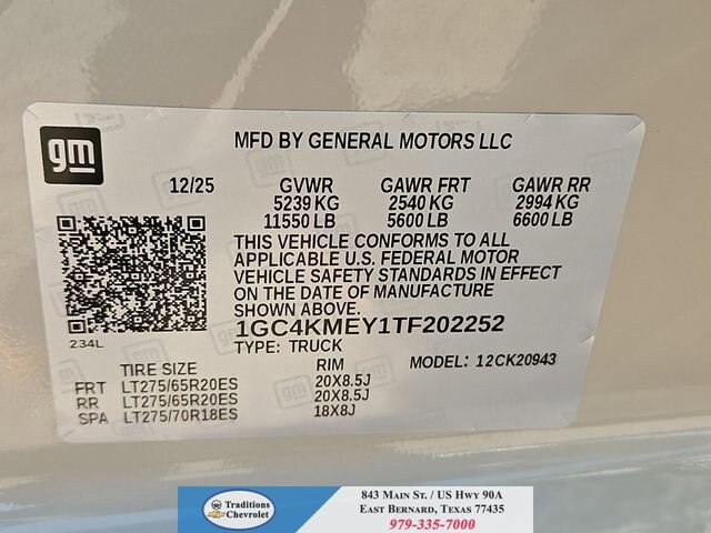 10-Speed Automatic, 4WD, Black Cloth.Custom Convenience Package (10-Way Power Driver Seat Adjuster with Lumbar, 120-Volt Bed Mounted Power Outlet, 120-Volt Interior Power Outlet, Dual Rear USB Ports (charge Only), Electric Rear-Window Defogger, EZ Lift Power Lock and Release Tailgate, LED Cargo Area Lighting, Remote Vehicle Starter System, and Unauthorized Entry Theft-Deterrent System), Custom Value Package (Auto-Dimming Inside Rear-View Mirror and Heated and Auto-Dimming Vertical Trailering Mirrors), CX Safety Package (Lane Change Alert with Side Blind Zone Alert, Rear Cross Traffic Alert, and Ultrasonic Front and Rear Park Assist), Gooseneck/5th Wheel Prep Package (Black Chevytec Spray-on Bedliner), Hitch Package, Preferred Equipment Group 1CX (170 Amp Alternator, 2-Speed Electronic Shift Transfer Case, 3.5 Diagonal Monochromatic Display DIC, Black Mirror Caps, Bluetooth® For Phone, Chevrolet Connected Access Capable, Color-Keyed Carpeting Floor Covering, Compass, Deep-Tinted Glass, Durabed Pickup Bed, Electronic Cruise Control with Set and Resume Speed, Front Rubberized Vinyl Floor Mats, HD Rear Vision Camera, Heated Vertical Trailering Mirrors, Locking Tailgate, Manual Tailgate Function with No EZ Lift, Manual Tilt-Wheel Steering Column, OnStar Services Capable, Power Door Locks, Power Front Windows with Driver Express Up/Down, Power Front Windows with Passenger Express Down, Power Rear Windows with Express Down, Push Button Start, Rear 60/40 Folding Bench Seat (folds Up), Rear Rubberized Vinyl Floor Mats, Remote Keyless Entry, SiriusXM with 360L Trial Subscription, Standard Tailgate, Wheels: 20 10-Spoke Machined Aluminum, Wi-Fi Hotspot Capable, and Wireless Phone Projection), Suspension Package, 10-Speed Automatic, 4WD, Black Cloth, 220 Amp Alternator, 4-Wheel Disc Brakes, 6 Speakers, 6-Speaker Audio System, 720 Cold-Cranking Amps Heavy-Duty Battery, ABS brakes, Air Conditioning, Alloy wheels, AM/FM radio: SiriusXM with 360L, Apple CarPlay/Android Auto, Auto High-beam Headlights, Brake assist, Cloth Seat Trim, Delay-off headlights, Driver door bin, Dual front impact airbags, Dual front side impact airbags, Electronic Stability Control, Emergency communication system: OnStar, Engine Block Heater, Exhaust Brake, Front 40/20/40 Split-Bench Seats with Lockable Storage, Front anti-roll bar, Front Black Bowtie Emblem, Front Center Armrest w/Storage, Front License Plate Kit, Front reading lights, Front wheel independent suspension, Fully automatic headlights, Heated door mirrors, High Idle Switch, Illuminated entry, Low tire pressure warning, Occupant sensing airbag, Outside temperature display, Overhead airbag, Overhead console, Panic alarm, Passenger door bin, Passenger vanity mirror, Power door mirrors, Power steering, Power windows, Premium audio system: Chevrolet Infotainment 3, Radio: Chevrolet Infotainment 3 System, Rear reading lights, Rear step bumper, Remote keyless entry, Speed control, Split folding rear seat, Tachometer, Tilt steering wheel, Traction control, Trip computer, Turn signal indicator mirrors, Variably intermittent wipers, Voltmeter, and Winter Grille Cover. Tax, title, license and dealer fees (unless itemized above) are extra. Not available with special finance or lease offers. See Dealer for Details. Price includes: $1000 - Customer Cash. Exp. 03/02/2026