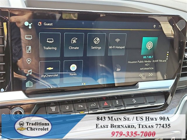 Gooseneck/5th Wheel Prep Package (Black Chevytec Spray-on Bedliner), Hitch Package, LTZ Convenience Package (2 Charge/Data USB Ports Inside Center Console, BOSE Premium 7-Speaker Sound System, Floor-Mounted Center Console, Front Bucket Seats, LED Cargo Area Lighting, Ventilated Driver and Front Passenger Seats, and Wireless Charging), LTZ Convenience Package II (Adaptive Cruise Control, Heated 2nd Row Outboard Seats, Power Sliding Rear Window with Defogger, and Universal Home Remote), LTZ Premium Texas Edition, Preferred Equipment Group 1LZ (10-Way Power Driver Seat Adjuster with Lumbar, 10-Way Power Passenger Seat Adjuster with Lumbar, 120-Volt Bed Mounted Power Outlet, 120-Volt Interior Power Outlet, 170 Amp Alternator, 6-Speaker Audio System, Auto-Dimming Inside Rear-View Mirror, Bluetooth® For Phone, Chevrolet Connected Access Capable, Chrome Door Handles, Chrome Mirror Caps, Color-Keyed Carpeting Floor Covering, Compass, Deep-Tinted Glass, Driver Memory, Durabed Pickup Bed, Electric Rear-Window Defogger, Electronic Cruise Control with Set and Resume Speed, EZ Lift Power Lock and Release Tailgate, Front 40/20/40 Split-Bench Seats with Lockable Storage, Front LED Fog Lamps, Front Rain-Sensing Wipers, Front Rubberized Vinyl Floor Mats, HD Rear Vision Camera, Heated Driver and Front Outboard Passenger Seating, Heated Steering Wheel, Hitch Guidance with Hitch View, in-Vehicle Trailering App System, Keyless Open and Start, Manual Tilt and Telescoping Steering Column, OnStar Services Capable, Perforated Leather-Appointed Front Outboard Seat Trim, Power Door Locks, Power Front Windows with Driver Express Up/Down, Power Front Windows with Passenger Express Up/Down, Power Rear Windows with Express Down, Push Button Start, Rear Rubberized Vinyl Floor Mats, Rear Wheelhouse Liners, Remote Vehicle Starter System, SiriusXM with 360L Trial Subscription, Standard Tailgate, Steering Wheel Audio Controls, Unauthorized Entry Theft-Deterrent System, Wheels: 18 Machined Aluminum with Silver Painted Accents, Wi-Fi Hotspot Capable, Wireless Phone Projection, and Wrapped Steering Wheel), Safety Package (Bed View Camera with Two Trailer Camera Provisions, HD Surround Vision, Rear Cross Traffic Alert, Safety Alert Seat, Trailer Camera Provisions, Trailer Side Blind Zone Alert, and Ultrasonic Front and Rear Park Assist), Suspension Package, Technology Package (15 Diagonal Multicolor Head-Up Display and Rear Camera Mirror), Up-Level Rear Seat with Storage Package, Z71 Off-Road and Protection Package (1st and 2nd Row All-Weather Floor Liners), Z71 Off-Road Package (Hill Descent Control and Off-Road Suspension), 10-Speed Automatic, 4WD, Jet Black Leather, 4-Wheel Disc Brakes, 6 Speakers, 720 Cold-Cranking Amps Heavy-Duty Battery, ABS brakes, Air Conditioning, Alloy wheels, AM/FM radio: SiriusXM with 360L, Apple CarPlay/Android Auto, Auto High-beam Headlights, Auto-dimming door mirrors, Auto-dimming Rear-View mirror, Automatic temperature control, Brake assist, Bumpers: chrome, Delay-off headlights, Driver door bin, Driver vanity mirror, Dual 220-Amp Primary/170-Amp Auxiliary Alternators, Dual front impact airbags, Dual front side impact airbags, Electronic Stability Control, Emergency communication system: OnStar, Engine Block Heater, Exhaust Brake, Front anti-roll bar, Front Center Armrest w/Storage, Front dual zone A/C, Front fog lights, Front License Plate Kit, Front reading lights, Front wheel independent suspension, Fully automatic headlights, Heated door mirrors, Heated front seats, Heated steering wheel, High Idle Switch, Illuminated entry, LED Smoked Amber Roof Marker Lamps, Low tire pressure warning, Memory seat, Occupant sensing airbag, Outside temperature display, Overhead airbag, Overhead con Tax, title, license and dealer fees (unless itemized above) are extra. Not available with special finance or lease offers. See Dealer for Details. Pric