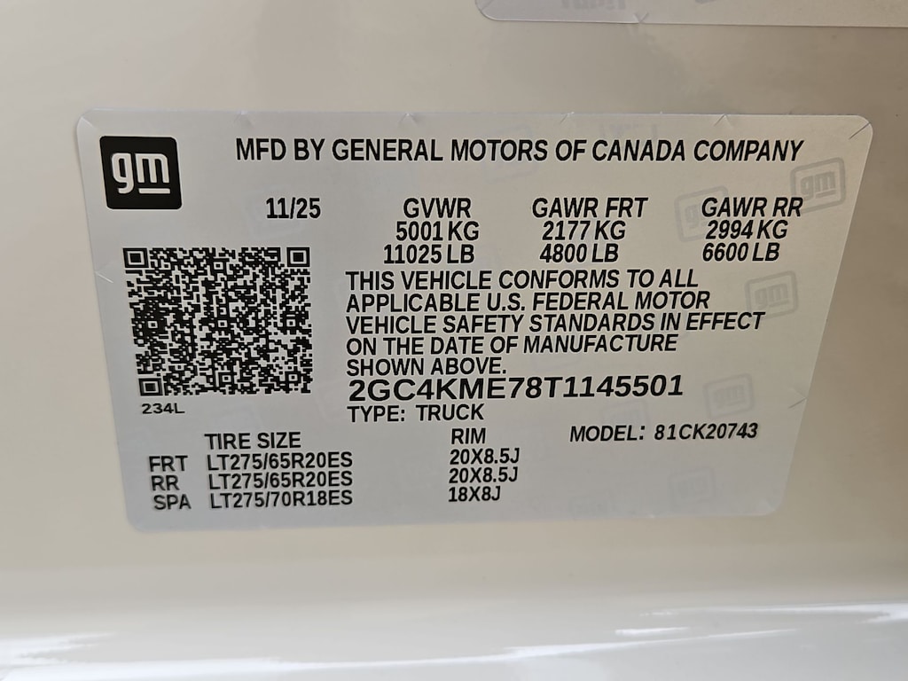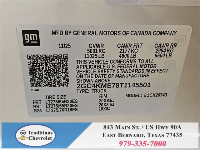 Custom Convenience Package (10-Way Power Driver Seat Adjuster with Lumbar, 120-Volt Bed Mounted Power Outlet, 120-Volt Interior Power Outlet, Dual Rear USB Ports (charge Only), Electric Rear-Window Defogger, EZ Lift Power Lock and Release Tailgate, LED Cargo Area Lighting, Remote Vehicle Starter System, and Unauthorized Entry Theft-Deterrent System), Custom Value Package (Auto-Dimming Inside Rear-View Mirror and Heated and Auto-Dimming Vertical Trailering Mirrors), CX Safety Package (Lane Change Alert with Side Blind Zone Alert, Rear Cross Traffic Alert, and Ultrasonic Front and Rear Park Assist), Preferred Equipment Group 1CX (170 Amp Alternator, 2-Speed Electronic Shift Transfer Case, 3.5 Diagonal Monochromatic Display DIC, 3.73 Rear Axle Ratio, Black Mirror Caps, Bluetooth® For Phone, Chevrolet Connected Access Capable, Color-Keyed Carpeting Floor Covering, Compass, Deep-Tinted Glass, Durabed Pickup Bed, Electronic Cruise Control with Set and Resume Speed, Front Rubberized Vinyl Floor Mats, HD Rear Vision Camera, Heated Vertical Trailering Mirrors, Locking Tailgate, Manual Tailgate Function with No EZ Lift, Manual Tilt-Wheel Steering Column, OnStar Services Capable, Power Door Locks, Power Front Windows with Driver Express Up/Down, Power Front Windows with Passenger Express Down, Power Rear Windows with Express Down, Push Button Start, Rear 60/40 Folding Bench Seat (folds Up), Rear Rubberized Vinyl Floor Mats, Remote Keyless Entry, SiriusXM with 360L Trial Subscription, Standard Tailgate, Wheels: 20 10-Spoke Machined Aluminum, Wi-Fi Hotspot Capable, and Wireless Phone Projection), Suspension Package, 10-Speed Automatic, 4WD, Jet Black Cloth, 4-Wheel Disc Brakes, 4 Round Black Assist Steps, 6 Speakers, 6-Speaker Audio System, 720 Cold-Cranking Amps Heavy-Duty Battery, ABS brakes, Air Conditioning, Alloy wheels, AM/FM radio: SiriusXM with 360L, Apple CarPlay/Android Auto, Auto High-beam Headlights, Bed View Camera, Black Chevytec Spray-on Bedliner, Brake assist, Cloth Seat Trim, Delay-off headlights, Driver door bin, Dual front impact airbags, Dual front side impact airbags, Electronic Stability Control, Emergency communication system: OnStar, Front 40/20/40 Split-Bench Seats with Lockable Storage, Front anti-roll bar, Front Black Bowtie Emblem, Front Center Armrest w/Storage, Front License Plate Kit, Front reading lights, Front wheel independent suspension, Fully automatic headlights, Heated door mirrors, Illuminated entry, Inside Rear-View Auto-Dimming Mirror, Low tire pressure warning, Occupant sensing airbag, Outside temperature display, Overhead airbag, Overhead console, Panic alarm, Passenger door bin, Passenger vanity mirror, Power door mirrors, Power steering, Power windows, Premium audio system: Chevrolet Infotainment 3, Radio: Chevrolet Infotainment 3 System, Rear reading lights, Rear step bumper, Remote keyless entry, Speed control, Split folding rear seat, Tachometer, Tilt steering wheel, Traction control, Trip computer, Turn signal indicator mirrors, Variably intermittent wipers, and Voltmeter. Tax, title, license and dealer fees (unless itemized above) are extra. Not available with special finance or lease offers. See Dealer for Details. Price includes: $1000 - Customer Cash. Exp. 02/02/2026
