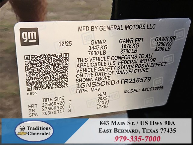 Comfort Package (2nd Row Power Release 60/40 Split-Folding Bench Seat, 3rd Row 60/40 Power-Folding Split-Bench, Bose 10-Speaker Surround with CenterPoint, Heated 2nd Row Outboard Seats, Heated Power-Adjustable Outside Mirrors, Heated Steering Wheel, LED Headlamps with LED Daytime Running Lamps, LED Tail Lamps, and Memory Settings), License Plate Front Mounting Package, Luxury Package (Auto-Dimming Inside Rear-View Mirror, Front LED Fog Lamps, and Universal Home Remote), Preferred Equipment Group 1LT (8-Way Power Front Passenger Seat Adjuster, Heated Driver and Front Passenger Seats, Interior Camera, Memory Settings For Driver, Rear Power Liftgate, and Wireless Phone Charging), 2-Way Driver Power Lumbar Seat Adjuster, 2-Way Front Passenger Power Lumbar Seat Adjuster, 3.23 Rear Axle Ratio, 3rd row seats: split-bench, 4-Wheel Disc Brakes, 6 Speakers, 6-Speaker Audio System, 8-Way Power Driver Seat Adjuster, ABS brakes, Air Conditioning, Alloy wheels, AM/FM radio: SiriusXM with 360L, Apple CarPlay/Android Auto, Auto High-beam Headlights, Automatic temperature control, Brake assist, Bumpers: body-color, Compass, Delay-off headlights, Driver door bin, Driver vanity mirror, Dual front impact airbags, Dual front side impact airbags, Electronic Stability Control, Emergency communication system: OnStar Services capable, Exterior Parking Camera Rear, Four wheel independent suspension, Front anti-roll bar, Front Bucket Seats, Front Center Armrest, Front dual zone A/C, Front reading lights, Fully automatic headlights, Heated door mirrors, Heated front seats, Illuminated entry, Leather-Appointed Seating, Low tire pressure warning, Memory seat, Navigation system: Google built-in compatibility (select service plan required, terms and limitations apply), Occupant sensing airbag, Outside temperature display, Overhead airbag, Overhead console, Panic alarm, Passenger door bin, Passenger vanity mirror, Power door mirrors, Power driver seat, Power Liftgate, Power passenger seat, Power Release 2nd Row Bucket Seats, Power steering, Power windows, Premium Smooth Ride Suspension, Radio data system, Radio: 17.7 Diagonal Advanced Color LCD Display, Rain sensing wipers, Rear air conditioning, Rear anti-roll bar, Rear reading lights, Rear seat center armrest, Rear window defroster, Rear window wiper, Remote keyless entry, Security system, SiriusXM with 360L Trial Subscription, Speed control, Speed-sensing steering, Split folding rear seat, Spoiler, Steering wheel mounted audio controls, Tachometer, Telescoping steering wheel, Tilt steering wheel, Traction control, Trip computer, Variably intermittent wipers, Voltmeter, Wheels: 18 x 8.5 Bright Silver Painted Aluminum, Wheels: 20 x 9 Machined Aluminum, and Wireless Apple CarPlay/Wireless Android Auto. Tax, title, license and dealer fees (unless itemized above) are extra. Not available with special finance or lease offers. See Dealer for Details. Price includes: $1500 - Select Inventory Cash Allowance. Exp. 02/02/2026