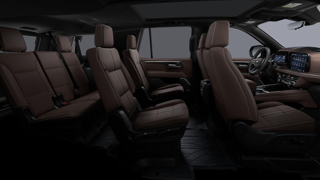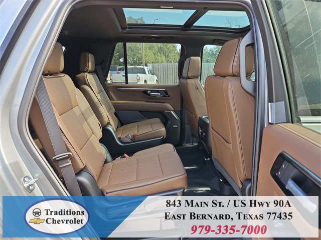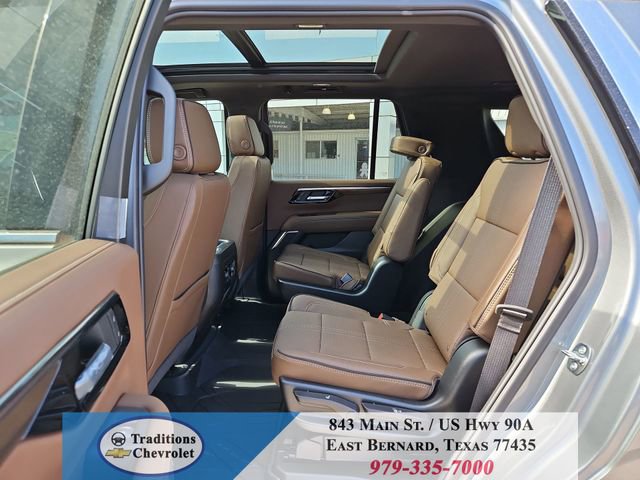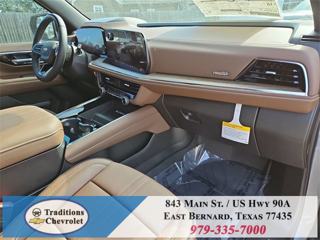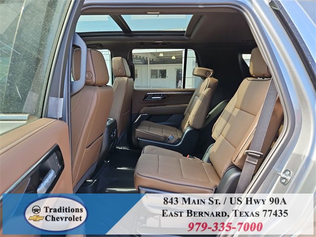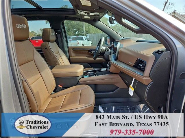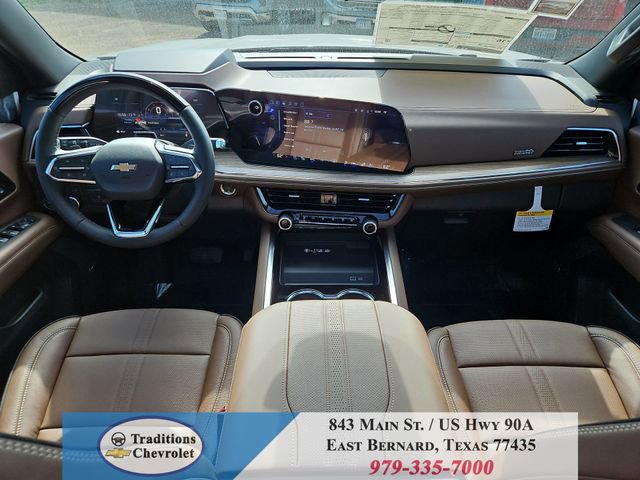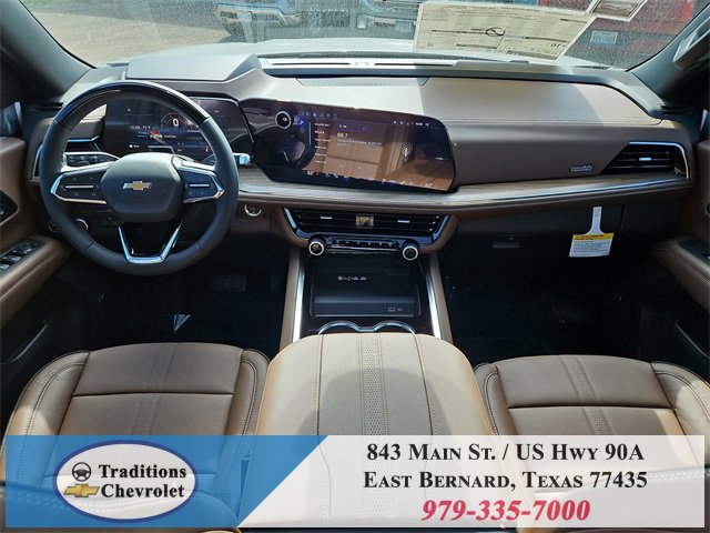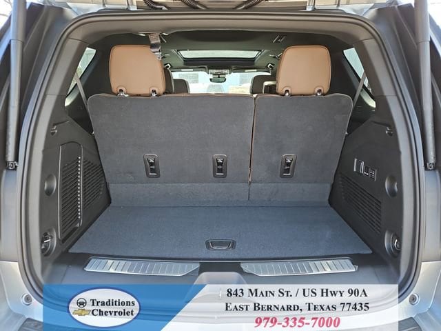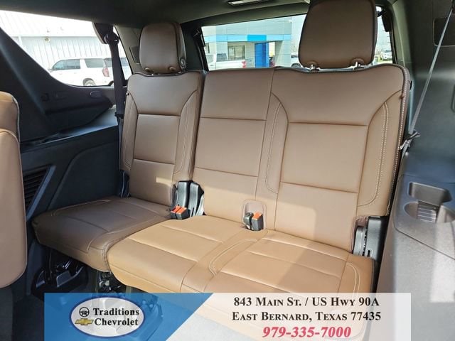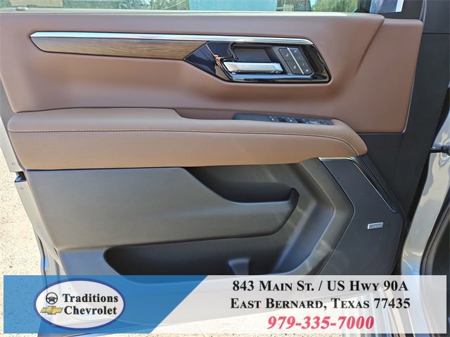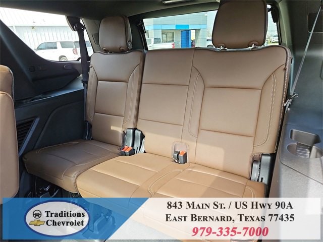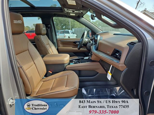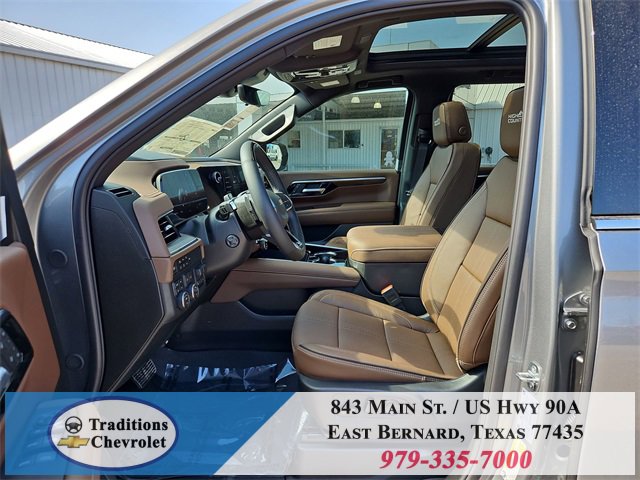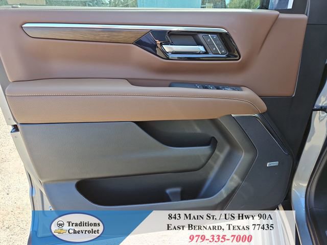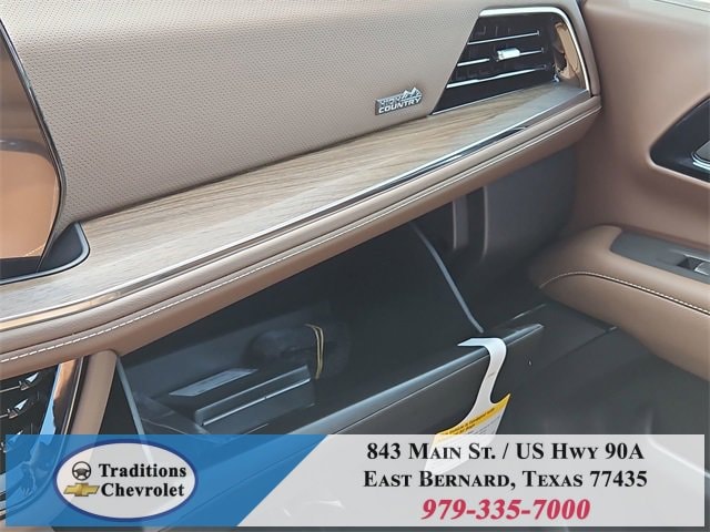 Advanced Trailering Package (Blind Zone Steering Assist with Trailering, Hitch View with Pan/Zoom Image Adjustment, and Smart Trailer Integration Indicator), High Country Deluxe (Air Ride Adaptive Suspension, Dual-Pane Power Panoramic Sunroof, and Power-Retractable Assist Steps), License Plate Front Mounting Package, Max Trailering Package (2-Speed Active Electronic AutoTrac Transfer Case, Hill Descent Control, and Integrated Trailer Brake Controller), Preferred Equipment Group 3LZ (15 Diagonal Multi-Color Head-Up Display, 1st and 2nd Row Color-Keyed Carpeted Floor Mats, 3-Spoke Wrapped Steering Wheel, 3rd Row 60/40 Power-Folding Split-Bench Seat, Bose 10-Speaker Centerpoint Surround Audio System Feature, Bright Front and Rear Door Sill Plates, Chrome Door Handles with Body-Color Strip, Color-Keyed Carpeting Floor Covering, Dual Exhaust System, Floor Console, Front Bucket Seats, Front LED Fog Lamps, Frontal Driver and Outboard Passenger Airbags, Heated 2nd Row Outboard Seats, Heated Steering Wheel, Inside Rearview Auo-Dimming Rear Camera Mirror, Interior Camera, Key Card, LED Headlamps with LED Daytime Running Lamps, LED Tail Lamps, Magnetic Ride Control Suspension, Memory Settings, Outside Heated Power-Adjustable Mirrors, Power Release 2nd Row Bucket Seats, Power Tilt and Telescopic Steering Column, Rear Power Liftgate, Remote Start, Set of 4 Wheel Locks, SiriusXM with 360L Trial Subscription, Universal Home Remote, Wheels: 22 x 9 Bright Machined Aluminum, and Wireless Phone Charging), 4WD, Jet Black/Mocha Leather, 10 Speakers, 1st and 2nd Rows All-Weather Floor Liners, 3.23 Rear Axle Ratio, 3rd row seats: split-bench, 4-Way Power Driver Lumbar Seat Adjuster, 4-Way Power Front Passenger Lumbar Seat Adjuster, 4-Wheel Disc Brakes, 8-Way Power Driver Seat Adjuster, 8-Way Power Front Passenger Seat Adjuster, ABS brakes, Adaptive suspension, Air Conditioning, Alloy wheels, AM/FM radio: SiriusXM with 360L, Apple CarPlay/Android Auto, Auto High-beam Headlights, Auto-dimming door mirrors, Auto-dimming Rear-View mirror, Auto-leveling suspension, Automatic temperature control, Brake assist, Bumpers: body-color, Compass, Delay-off headlights, Driver and Front Passenger Heated and Ventilated Seats, Driver door bin, Driver vanity mirror, Dual front impact airbags, Dual front side impact airbags, Electronic Stability Control, Emergency communication system: OnStar and Chevrolet connected services capable, Exterior Parking Camera Rear, Extra Capacity Cooling System, Four wheel independent suspension, Front anti-roll bar, Front Center Armrest, Front dual zone A/C, Front fog lights, Front reading lights, Fully automatic headlights, Garage door transmitter, Heads-Up Display, Heated door mirrors, Heated Driver and Front Passenger Seats, Heated front seats, Heated rear seats, Heated steering wheel, Illuminated entry, Low tire pressure warning, Memory seat, Navigation system: Google built-in compatibility (select service plan required, terms and limitations apply), Occupant sensing airbag, Outside temperature display, Overhead airbag, Overhead console, Panic alarm, Passenger door bin, Passenger vanity mirror, Perforated Leather Seat Trim, Power door mirrors, Power driver seat, Power Liftgate, Power passenger seat, Power steering, Power windows, Premium audio system: Chevrolet Infotainment 3 Premium, Radio data system, Radio: 17.7 Diagonal Advanced Color LCD Display, Rain sensing wipers, Rear air conditioning, Rear anti-roll bar, Rear reading lights, Rear window defroster, Rear window wiper, Remote keyless entry, Security system, Speed control, Speed-sensing steering, Split folding rear seat, Spoiler, Steering wheel memory, Steering wheel mounted audio controls, Super Cruise, Tachometer, Telescoping steering wheel, Tilt steering wheel, Traction control, Trip computer, Turn signal indicator mirrors, Variably intermittent wipers, Ventilated front seats, and Voltme