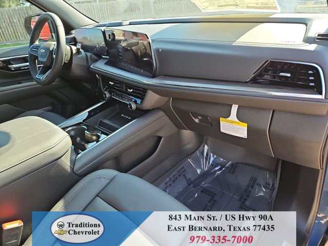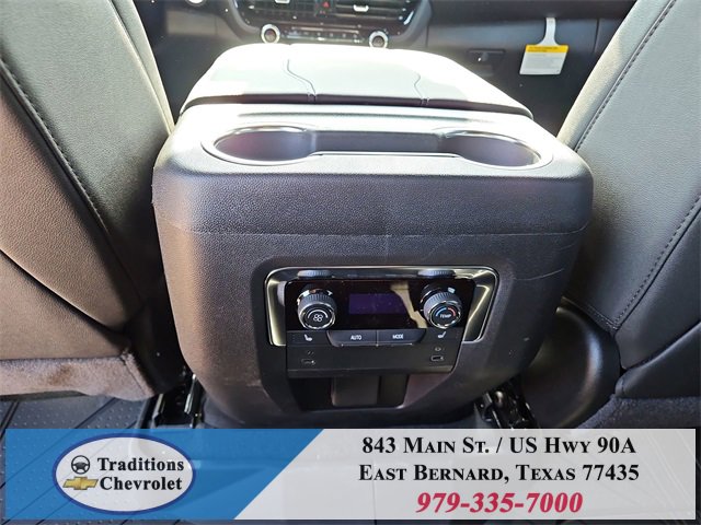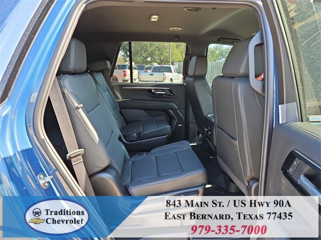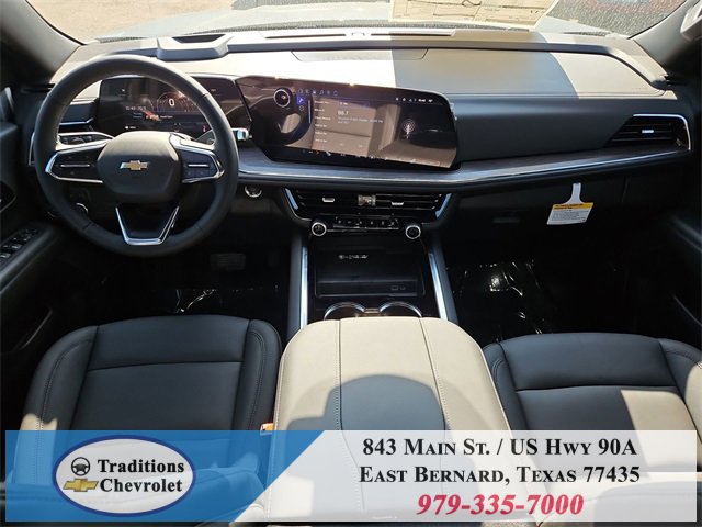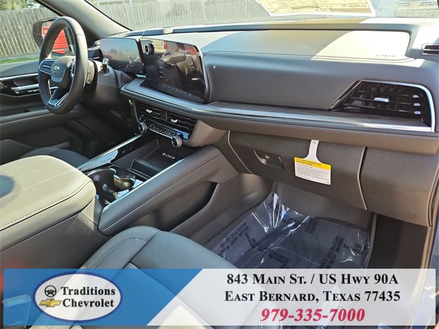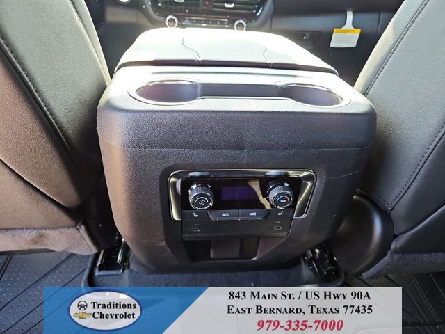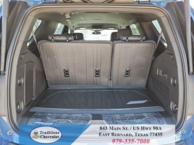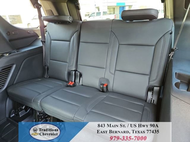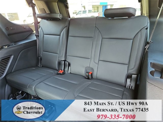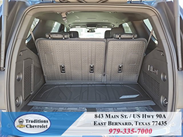 All-Weather Liner Protection Package (1st and 2nd Rows All-Weather Floor Liners, 3rd Row All-Weather Floor Liners, and All-Weather Cargo Mat), Comfort Package (2nd Row Power Release 60/40 Split-Folding Bench Seat, 3rd Row 60/40 Power-Folding Split-Bench Seat, Bose 10-Speaker Centerpoint Surround Audio System Feature, Heated 2nd Row Outboard Seats, Heated Steering Wheel, LED Headlamps with LED Daytime Running Lamps, LED Tail Lamps, Memory Settings, and Outside Heated Power-Adjustable Mirrors), License Plate Front Mounting Package, Luxury Package (Auto-Dimming Inside Rear-View Mirror, Front LED Fog Lamps, and Universal Home Remote), Preferred Equipment Group 1LT (1st and 2nd Row Color-Keyed Carpeted Floor Mats, 3-Spoke Wrapped Steering Wheel, 3rd Row Manual 60/40 Split-Folding Bench Seats, Color-Keyed Carpeting Floor Covering, Floor Console with Storage Area, Front Bucket Seats, Frontal Driver and Outboard Passenger Airbags, Interior Camera, Key Card, Memory Settings For Driver, Rear Power Liftgate, Remote Start, SiriusXM with 360L Trial Subscription, USB Ports, and Wireless Phone Charging), Black Leather, 2-Way Power Driver Lumbar Seat Adjuster, 2-Way Power Front Passenger Lumbar Seat Adjuster, 3.23 Rear Axle Ratio, 3rd row seats: split-bench, 4-Wheel Disc Brakes, 6 Speakers, 6-Speaker Audio System Feature, 8-Way Power Driver Seat Adjuster, 8-Way Power Front Passenger Seat Adjuster, ABS brakes, Air Conditioning, Alloy wheels, AM/FM radio: SiriusXM with 360L, Apple CarPlay/Android Auto, Auto High-beam Headlights, Automatic temperature control, Brake assist, Bumpers: body-color, Compass, Delay-off headlights, Driver door bin, Driver vanity mirror, Dual front impact airbags, Dual front side impact airbags, Electronic Stability Control, Emergency communication system: OnStar and Chevrolet connected services capable, Exterior Parking Camera Rear, Four wheel independent suspension, Front anti-roll bar, Front Center Armrest, Front dual zone A/C, Front reading lights, Fully automatic headlights, Heated door mirrors, Heated Driver and Front Passenger Seats, Heated front seats, Illuminated entry, Leather-Appointed Seat Trim, Low tire pressure warning, Memory seat, Navigation system: Google built-in compatibility (select service plan required, terms and limitations apply), Occupant sensing airbag, Outside temperature display, Overhead airbag, Overhead console, Panic alarm, Passenger door bin, Passenger vanity mirror, Power door mirrors, Power driver seat, Power Liftgate, Power passenger seat, Power Release 2nd Row Bucket Seats, Power steering, Power windows, Premium audio system: Chevrolet Infotainment 3 Premium, Premium Smooth Ride Suspension, Radio data system, Radio: 17.7 Diagonal Advanced Color LCD Display, Rain sensing wipers, Rear air conditioning, Rear anti-roll bar, Rear reading lights, Rear seat center armrest, Rear window defroster, Rear window wiper, Remote keyless entry, Security system, Speed control, Speed-sensing steering, Split folding rear seat, Spoiler, Steering wheel mounted audio controls, Tachometer, Telescoping steering wheel, Tilt steering wheel, Traction control, Trip computer, Variably intermittent wipers, Voltmeter, Wheels: 18 x 8.5 Bright Silver Painted Aluminum, and Wheels: 20 x 9 Machined Aluminum.