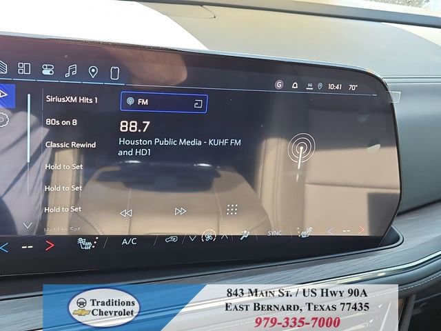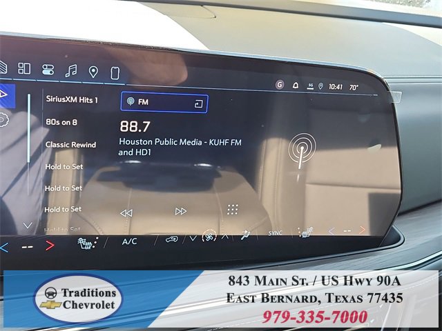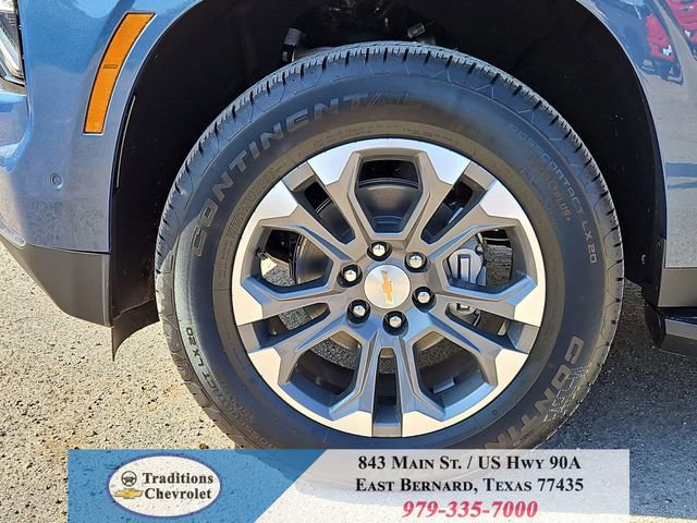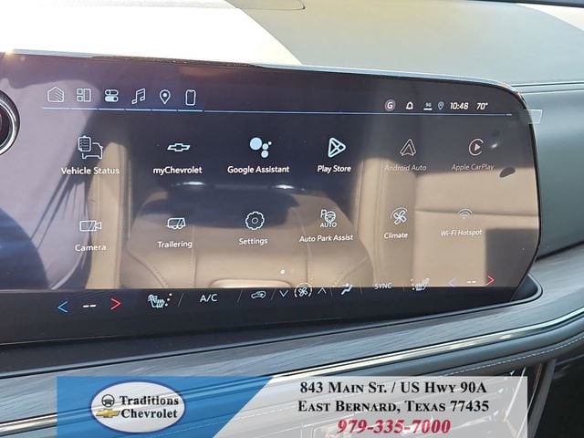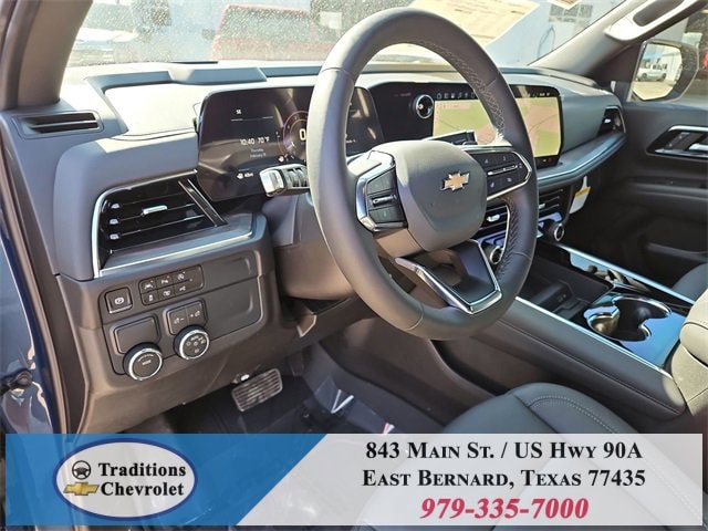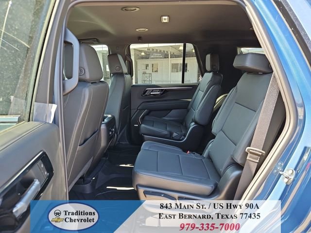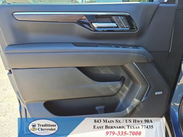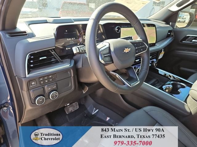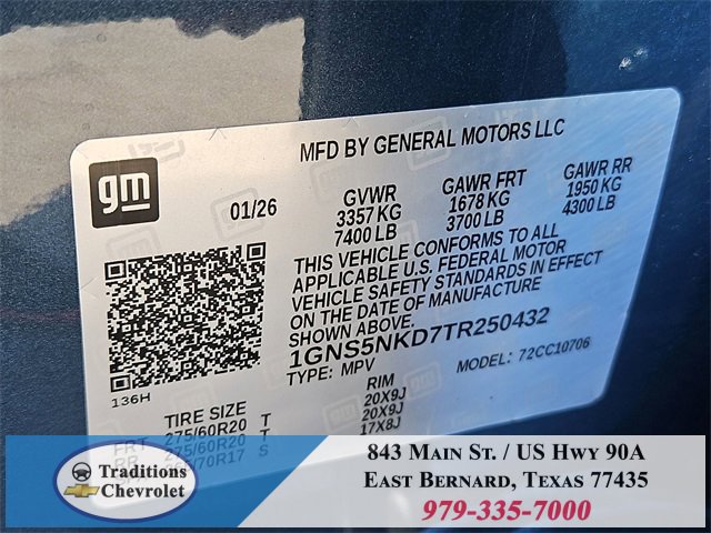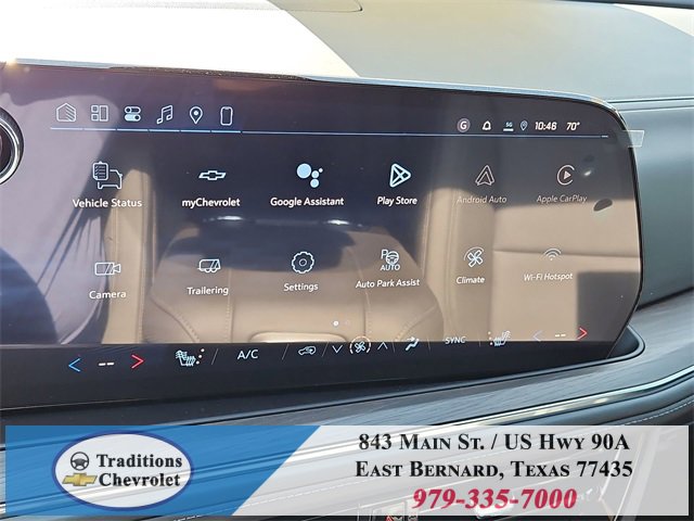 All-Weather Liner Protection Package (1st and 2nd Rows All-Weather Floor Liners, 3rd Row All-Weather Floor Liners, and All-Weather Cargo Mat), Comfort Package (2nd Row Power Release 60/40 Split-Folding Bench Seat, 3rd Row 60/40 Power-Folding Split-Bench Seat, Bose 10-Speaker Centerpoint Surround Audio System Feature, Heated 2nd Row Outboard Seats, Heated Steering Wheel, LED Headlamps with LED Daytime Running Lamps, LED Tail Lamps, Memory Settings, and Outside Heated Power-Adjustable Mirrors), License Plate Front Mounting Package, Luxury Package (Auto-Dimming Inside Rear-View Mirror, Front LED Fog Lamps, and Universal Home Remote), Preferred Equipment Group 1LT (1st and 2nd Row Color-Keyed Carpeted Floor Mats, 3-Spoke Wrapped Steering Wheel, 3rd Row Manual 60/40 Split-Folding Bench Seats, Color-Keyed Carpeting Floor Covering, Floor Console with Storage Area, Front Bucket Seats, Frontal Driver and Outboard Passenger Airbags, Interior Camera, Key Card, Memory Settings For Driver, Rear Power Liftgate, Remote Start, SiriusXM with 360L Trial Subscription, USB Ports, and Wireless Phone Charging), Black Leather, 2-Way Power Driver Lumbar Seat Adjuster, 2-Way Power Front Passenger Lumbar Seat Adjuster, 3.23 Rear Axle Ratio, 3rd row seats: split-bench, 4-Wheel Disc Brakes, 6 Speakers, 6-Speaker Audio System Feature, 8-Way Power Driver Seat Adjuster, 8-Way Power Front Passenger Seat Adjuster, ABS brakes, Air Conditioning, Alloy wheels, AM/FM radio: SiriusXM with 360L, Apple CarPlay/Android Auto, Auto High-beam Headlights, Automatic temperature control, Brake assist, Bumpers: body-color, Compass, Delay-off headlights, Driver door bin, Driver vanity mirror, Dual front impact airbags, Dual front side impact airbags, Electronic Stability Control, Emergency communication system: OnStar and Chevrolet connected services capable, Exterior Parking Camera Rear, Four wheel independent suspension, Front anti-roll bar, Front Center Armrest, Front dual zone A/C, Front reading lights, Fully automatic headlights, Heated door mirrors, Heated Driver and Front Passenger Seats, Heated front seats, Illuminated entry, Leather-Appointed Seat Trim, Low tire pressure warning, Memory seat, Navigation system: Google built-in compatibility (select service plan required, terms and limitations apply), Occupant sensing airbag, Outside temperature display, Overhead airbag, Overhead console, Panic alarm, Passenger door bin, Passenger vanity mirror, Power door mirrors, Power driver seat, Power Liftgate, Power passenger seat, Power Release 2nd Row Bucket Seats, Power steering, Power windows, Premium audio system: Chevrolet Infotainment 3 Premium, Premium Smooth Ride Suspension, Radio data system, Radio: 17.7 Diagonal Advanced Color LCD Display, Rain sensing wipers, Rear air conditioning, Rear anti-roll bar, Rear reading lights, Rear seat center armrest, Rear window defroster, Rear window wiper, Remote keyless entry, Security system, Speed control, Speed-sensing steering, Split folding rear seat, Spoiler, Steering wheel mounted audio controls, Tachometer, Telescoping steering wheel, Tilt steering wheel, Traction control, Trip computer, Variably intermittent wipers, Voltmeter, Wheels: 18 x 8.5 Bright Silver Painted Aluminum, and Wheels: 20 x 9 Machined Aluminum.