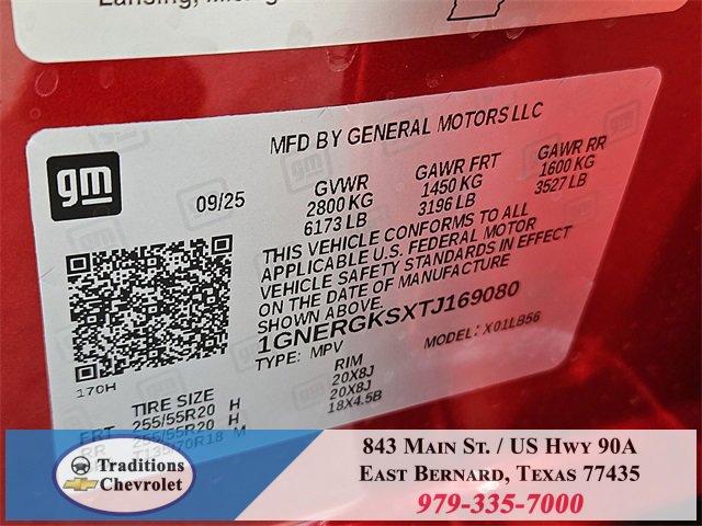 Midnight/Sport Edition (High Gloss Black Door Upper Molding and Wheels: 20 High Gloss Black Painted Aluminum), Preferred Equipment Group 1LT, 3rd row seats: split-bench, 4-Way Manual Front Passenger Seat Adjuster, 4-Wheel Disc Brakes, 6 Speakers, 6-Speaker Audio System Feature, 8-Way Power Driver Seat Adjuster, ABS brakes, Air Conditioning, Alloy wheels, AM/FM radio: SiriusXM with 360L, Apple CarPlay/Android Auto, Auto High-beam Headlights, Automatic temperature control, Brake assist, Bumpers: body-color, Child-Seat-Sensing Airbag, Compass, Delay-off headlights, Driver door bin, Driver vanity mirror, Dual front impact airbags, Dual front side impact airbags, Electronic Stability Control, Emergency communication system: OnStar, Four wheel independent suspension, Front anti-roll bar, Front Bucket Seats, Front Center Armrest, Front dual zone A/C, Front reading lights, Fully automatic headlights, Heated door mirrors, Heated Driver and Front Passenger Seats, Heated front seats, Heated steering wheel, Illuminated entry, Low tire pressure warning, Navigation System, Occupant sensing airbag, Outside temperature display, Overhead airbag, Overhead console, Panic alarm, Passenger door bin, Passenger vanity mirror, Power door mirrors, Power driver seat, Power Liftgate, Power steering, Power windows, Premium Cloth Seat Trim, Radio data system, Radio: : Audio System w/17.7 Diagonal Display, Rear air conditioning, Rear anti-roll bar, Rear reading lights, Rear window defroster, Rear window wiper, Remote keyless entry, Security system, SiriusXM with 360L Trial Subscription, Speed control, Speed-sensing steering, Spoiler, Steering wheel mounted audio controls, Tachometer, Telescoping steering wheel, Tilt steering wheel, Traction control, Trip computer, Turn signal indicator mirrors, Variably intermittent wipers, Voltmeter, and Wheels: 18 Grazen Metallic Machined-Face Aluminum. Tax, title, license and dealer fees (unless itemized above) are extra. Not available with special finance or lease offers. See Dealer for Details. Price includes: $1500 - Customer Cash. Exp. 01/02/2026