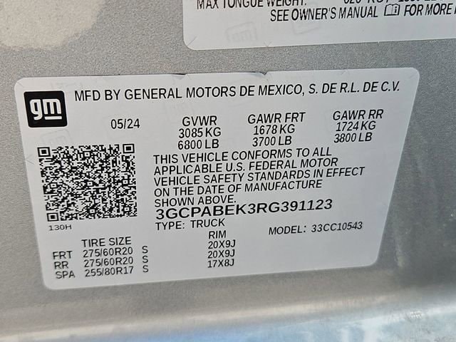 Custom Convenience Package (Electric Rear-Window Defogger, EZ Lift Power Lock & Release Tailgate, LED Cargo Area Lighting, Remote Vehicle Starter System, and Theft Deterrent System (Unauthorized Entry)), Custom Value Package, Dark Essentials Package (LPO) (Black Name Plates (LPO)), High Capacity Suspension Package, Preferred Equipment Group 1CX (10-Way Power Driver Seat w/Lumbar, 120-Volt Bed Mounted Power Outlet, 120-Volt Interior Power Outlet, 3.5 Monochromatic Display Driver Info Center, Bluetooth® For Phone, Chevrolet Connected Access Capable, Color-Keyed Carpeting Floor Covering, Deep-Tinted Glass, Dual Rear USB Ports (Charge Only), Electrical Steering Column Lock, Electronic Cruise Control, Front Frame-Mounted Black Recovery Hooks, Front Rubberized Vinyl Floor Mats, HD Rear Vision Camera, Manual Tilt Wheel Steering Column, OnStar & Chevrolet Connected Services Capable, Power Front Windows w/Driver Express Up/Down, Power Front Windows w/Passenger Express Down, Power Rear Windows w/Express Down, Rear 60/40 Folding Bench Seat (Folds Up), Rear Rubberized-Vinyl Floor Mats, Remote Keyless Entry, SiriusXM Radio, Standard Tailgate, and Wi-Fi Hot Spot Capable), Trailering Package (Hitch Guidance), TurboMax Blackout Package (4 Black Round Assist Steps (LPO) and Wheels: 20 x 9 High Gloss Black Painted Alum), 8-Speed Automatic, Black Cloth, 3.42 Rear Axle Ratio, 4-Wheel Disc Brakes, 40/20/40 Front Split-Bench Seat, 6 Speakers, 6-Speaker Audio System, ABS brakes, Air Conditioning, Alloy wheels, AM/FM radio: SiriusXM, Auto High-beam Headlights, Auto-Locking Rear Differential, Automatic Emergency Braking, Black Chrome Exhaust Tip (LPO), Black Tailgate CHEVROLET Lettering (LPO), Brake assist, Bumpers: body-color, Cloth Seat Trim, Compass, Delay-off headlights, Driver door bin, Driver vanity mirror, Dual front impact airbags, Dual front side impact airbags, Electronic Stability Control, Following Distance Indicator, Forward Collision Alert, Front anti-roll bar, Front Black Bowtie Emblem (LPO), Front Center Armrest w/Storage, Front License Plate Kit, Front Pedestrian Braking, Front reading lights, Front wheel independent suspension, Fully automatic headlights, Heated door mirrors, Illuminated entry, IntelliBeam Automatic High Beam On/Off, Lane Keep Assist w/Lane Departure Warning, Low tire pressure warning, Occupant sensing airbag, Outside temperature display, Overhead airbag, Overhead console, Panic alarm, Passenger door bin, Passenger vanity mirror, Power door mirrors, Power driver seat, Power steering, Power windows, Premium audio system: Chevrolet Infotainment 3, Radio data system, Radio: Chevrolet Infotainment 3 System, Rear reading lights, Rear step bumper, Rear Wheelhouse Liners, Rear window defroster, Remote keyless entry, Security system, Single Outlet Exhaust, Speed control, Speed-sensing steering, Split folding rear seat, Tachometer, Tilt steering wheel, Traction control, Trip computer, Variably intermittent wipers, Voltmeter, Wheel Locks (Set of 4) (LPO), and Wheels: 20 x 9 Bright Silver Painted Aluminum.