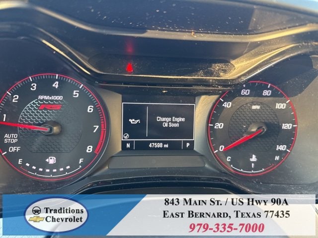 License Plate Front Mounting Package, Preferred Equipment Group 1RS, 2-Way Adjustable Front Head Restraints, 3.50 Final Drive Axle Ratio, 4 Speakers, 4-Speaker Audio System Feature, 4-Way Manual Front Passenger Seat Adjuster, 4-Wheel Disc Brakes, 6-Way Manual Driver Seat Adjuster, ABS brakes, Air Conditioning, Alloy wheels, AM/FM radio: SiriusXM, Auto High-beam Headlights, Brake assist, Bumpers: body-color, Cloth Seat Trim, Compass, Delay-off headlights, Driver door bin, Driver vanity mirror, Dual front impact airbags, Dual front side impact airbags, Electronic Stability Control, Emergency communication system: OnStar and Chevrolet connected services capable, Exterior Parking Camera Rear, Front anti-roll bar, Front Bucket Seats, Front Center Armrest, Front reading lights, Front wheel independent suspension, Fully automatic headlights, Heated door mirrors, Heated Driver & Front Passenger Seats, Heated front seats, Heated steering wheel, Illuminated entry, Low tire pressure warning, Occupant sensing airbag, Outside temperature display, Overhead airbag, Overhead console, Panic alarm, Passenger door bin, Passenger vanity mirror, Power door mirrors, Power steering, Power windows, Premium audio system: Chevrolet Infotainment 3, Radio data system, Radio: Chevrolet Infotainment 3 System w/AM/FM, Rear window defroster, Rear window wiper, Remote keyless entry, Security system, SiriusXM, Speed control, Split folding rear seat, Spoiler, Sport steering wheel, Steering wheel mounted audio controls, Tachometer, Telescoping steering wheel, Tilt steering wheel, Traction control, Trip computer, Variably intermittent wipers, and Wheels: 18 Black-Painted Machined Aluminum.