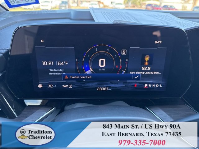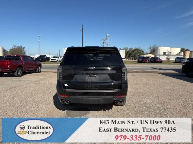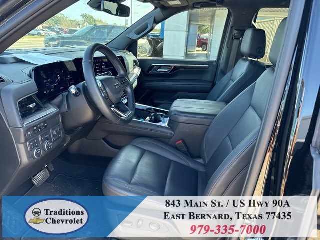 Advanced Trailering Package (Smart Trailer Integration Indicator), Comfort Package (3rd Row 60/40 Power-Folding Split-Bench Seat, Heated 2nd Row Outboard Seats, Heated Steering Wheel, LED Tail Lamps, Memory Settings, and Outside Heated Power-Adjustable Mirrors), License Plate Front Mounting Package, Max Trailering Package (Integrated Trailer Brake Controller), Preferred Equipment Group 2Z7 (2-Speed Active Electronic AutoTrac Transfer Case, 3-Spoke Wrapped Steering Wheel, 3rd Row Manual 60/40 Split-Folding Bench Seats, Auto-Dimming Inside Rear-View Mirror, Black Tubular Assist Steps, Color-Keyed Carpeting Floor Covering, Dual Exhaust System, Front Bucket Seats, Front High-Approach Angle Fascia, Front LED Fog Lamps, Hill Descent Control, Rear Power Liftgate, Red Horizontal-Mounted Recovery Hooks, Remote Start, Universal Home Remote, USB Ports, Wheels: 20 x 9 Bright Machined Aluminum, Wireless Phone Charging, and Z71 Exterior Features), CARBRAVO CERTIFIED Certified, 4WD, Black Leather, 2-Way Power Driver Lumbar Seat Adjuster, 2-Way Power Front Passenger Lumbar Seat Adjuster, 3.23 Rear Axle Ratio, 3rd row seats: split-bench, 4-Wheel Disc Brakes, 6 Speakers, 6-Speaker Audio System Feature, 8-Way Power Driver Seat Adjuster, 8-Way Power Front Passenger Seat Adjuster, ABS brakes, Air Conditioning, Alloy wheels, AM/FM radio: SiriusXM with 360L, Apple CarPlay/Android Auto, Auto High-beam Headlights, Auto-dimming Rear-View mirror, Automatic temperature control, Brake assist, Bumpers: body-color, Compass, Delay-off headlights, Driver door bin, Driver vanity mirror, Dual front impact airbags, Dual front side impact airbags, Dual-Pane Power Panoramic Sunroof, Electronic Stability Control, Emergency communication system: OnStar and Chevrolet connected services capable, Exterior Parking Camera Rear, Extra Capacity Cooling System, Four wheel independent suspension, Front anti-roll bar, Front Center Armrest, Front dual zone A/C, Front fog lights, Front reading lights, Fully automatic headlights, Garage door transmitter, Heated door mirrors, Heated front seats, Illuminated entry, Leather-Appointed Seat Trim, Low tire pressure warning, Memory seat, Navigation system: Google built-in compatibility (select service plan required, terms and limitations apply), Occupant sensing airbag, Outside temperature display, Overhead airbag, Overhead console, Panic alarm, Passenger door bin, Passenger vanity mirror, Power door mirrors, Power driver seat, Power Liftgate, Power passenger seat, Power Release 2nd Row Bucket Seats, Power steering, Power windows, Premium audio system: Chevrolet Infotainment 3 Premium, Premium Smooth Ride Suspension, Radio data system, Radio: 17.7 Diagonal Advanced Color LCD Display, Rain sensing wipers, Rear air conditioning, Rear anti-roll bar, Rear reading lights, Rear seat center armrest, Rear window defroster, Rear window wiper, Remote keyless entry, Security system, Speed control, Speed-sensing steering, Split folding rear seat, Spoiler, Steering wheel mounted audio controls, Tachometer, Telescoping steering wheel, Tilt steering wheel, Traction control, Trip computer, Variably intermittent wipers, and Voltmeter. Certification Program Details: CARBRAVO CERTIFIED