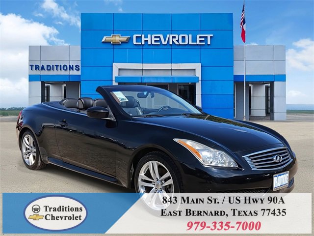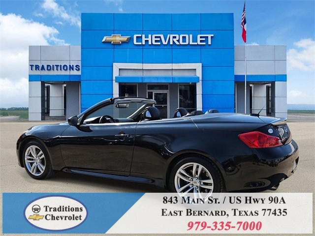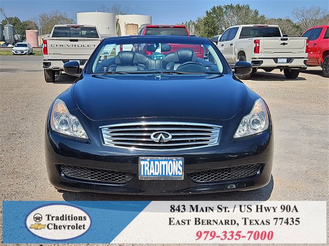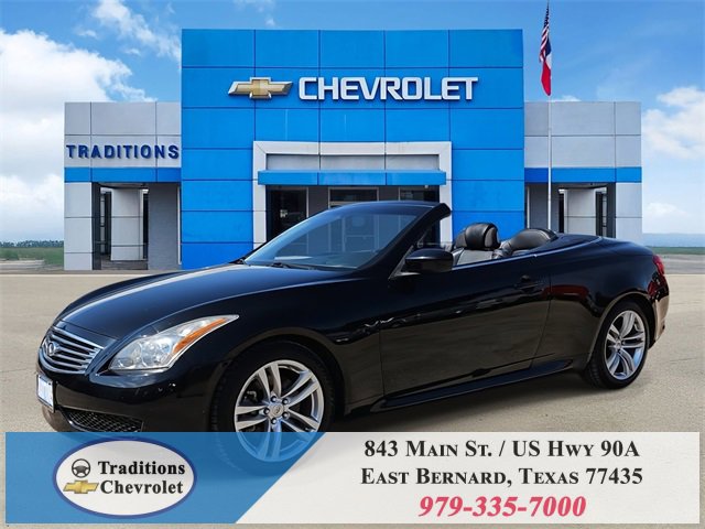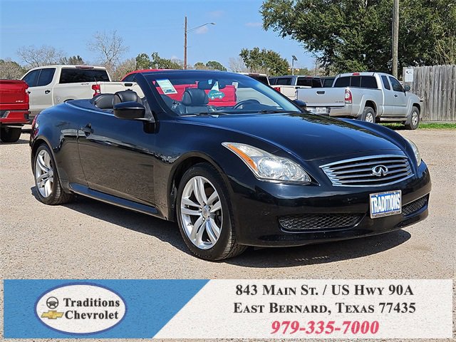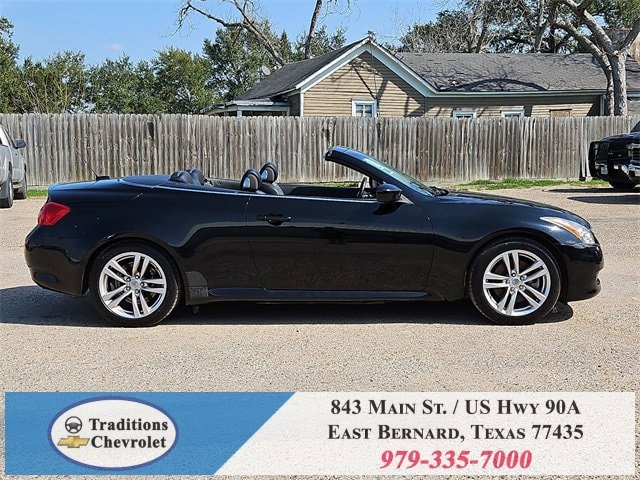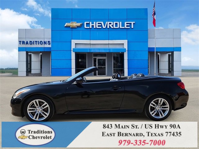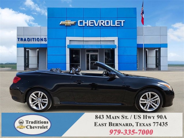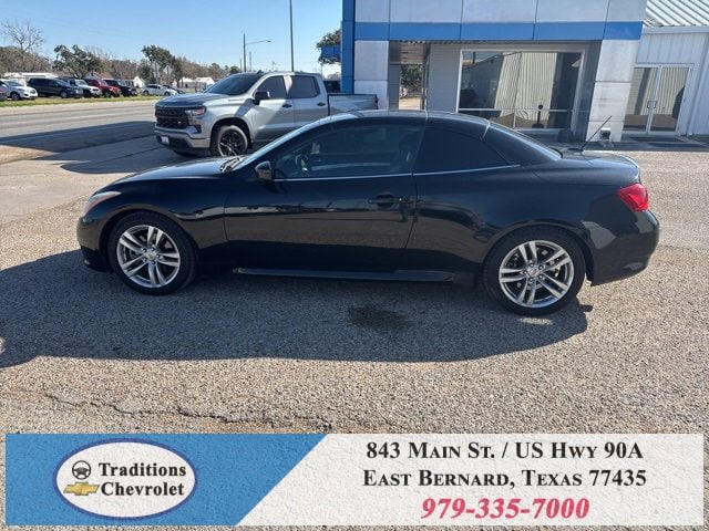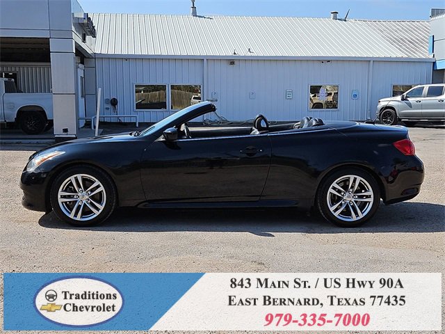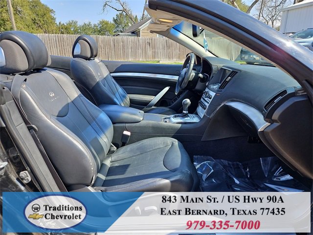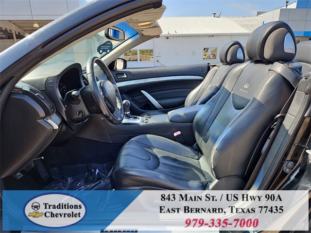 Navigation Package (9.3GB Music Box HD, Bluetooth® Advanced Audio Distribution, INFINITI Hard Drive Navigation System, and XM NavTraffic), Premium Package (2-Way Driver's Seat Power Lumbar Support, Climate Controlled Front Seats, Memory System, Power Tilt & Telescopic Steering Wheel, Radio: AM/FM w/BOSE Open Air Sound System, and Rear Sonar System), Graphite Leather, 18 Wheels, 19 9-Spoke Aluminum-Alloy Wheels, 4-Wheel Disc Brakes, 6 Speakers, ABS brakes, Air Conditioning, Alloy wheels, AM/FM radio: XM, AM/FM/CD Player w/MP3/WMA Capability, Anti-whiplash front head restraints, Automatic temperature control, Brake assist, Bumpers: body-color, CD player, Convertible HardTop, Convertible roof lining, Delay-off headlights, Driver door bin, Driver vanity mirror, Dual front impact airbags, Dual front side impact airbags, Electronic Stability Control, Exterior Parking Camera Rear, First Aid Kit, Four wheel independent suspension, Front anti-roll bar, Front Bucket Seats, Front Center Armrest, Front dual zone A/C, Front fog lights, Front reading lights, Fully automatic headlights, Garage door transmitter: HomeLink, Glass rear window, Heated door mirrors, Heated Front Bucket Seats, Heated front seats, High intensity discharge headlights: Bi-Xenon, Illuminated entry, Illuminated Kick Plates, Integrated roll-over protection, Leather Appointed Seats, Leather Shift Knob, Leather steering wheel, Low tire pressure warning, Occupant sensing airbag, Outside temperature display, Overhead airbag, Overhead console, Panic alarm, Passenger door bin, Passenger vanity mirror, Power convertible roof, Power door mirrors, Power driver seat, Power passenger seat, Power steering, Power windows, Radio data system, Rear anti-roll bar, Rear Wind Deflector, Rear window defroster, Remote keyless entry, Security system, Speed control, Speed-sensing steering, Speed-Sensitive Wipers, Steering wheel mounted audio controls, Tachometer, Telescoping steering wheel, Tilt steering wheel, Traction control, Trip computer, and Variably intermittent wipers.